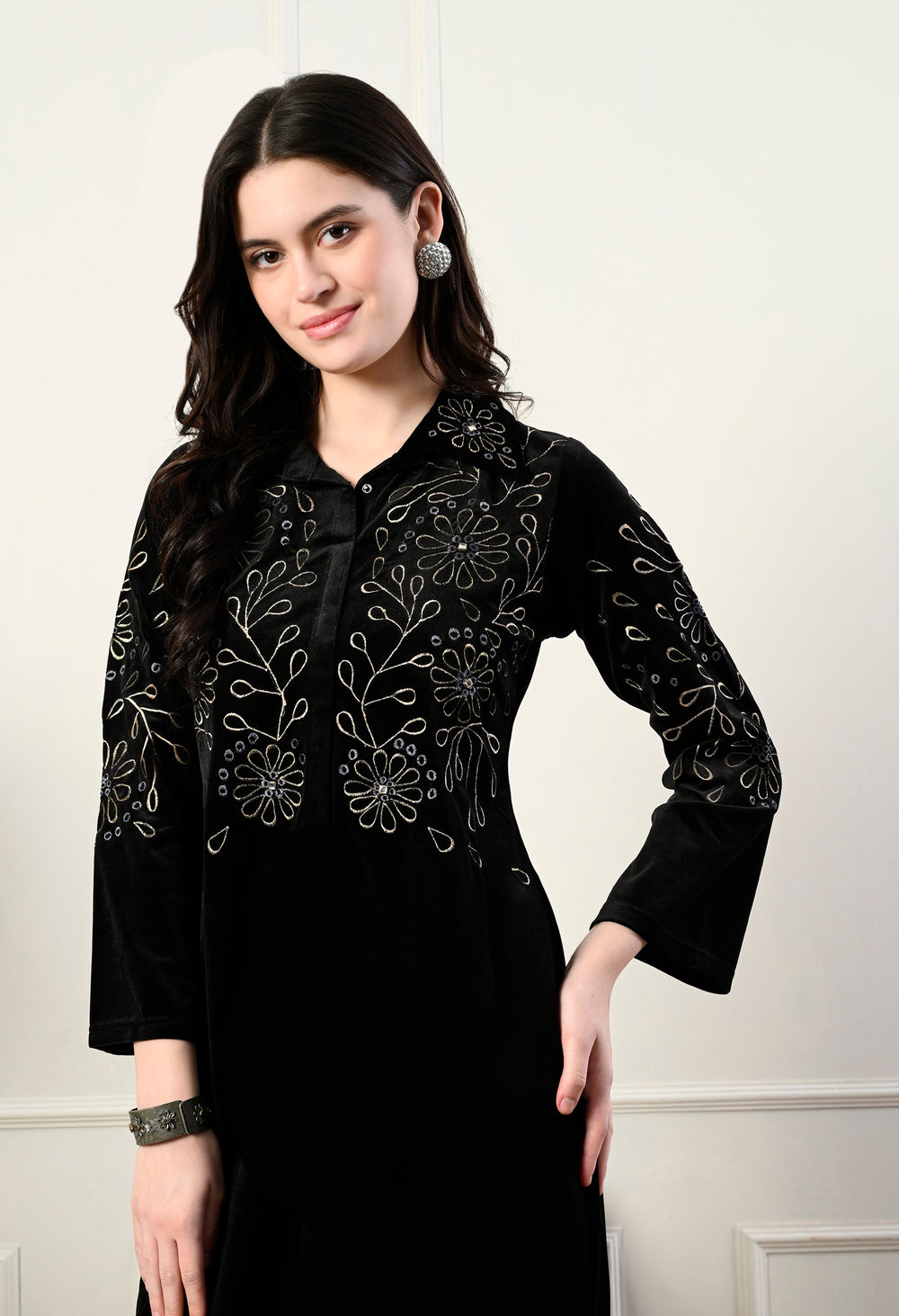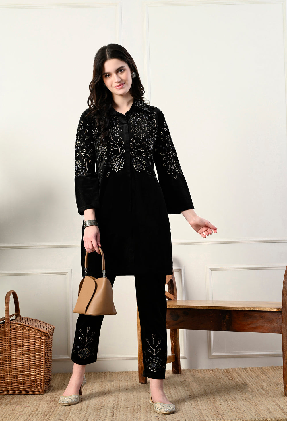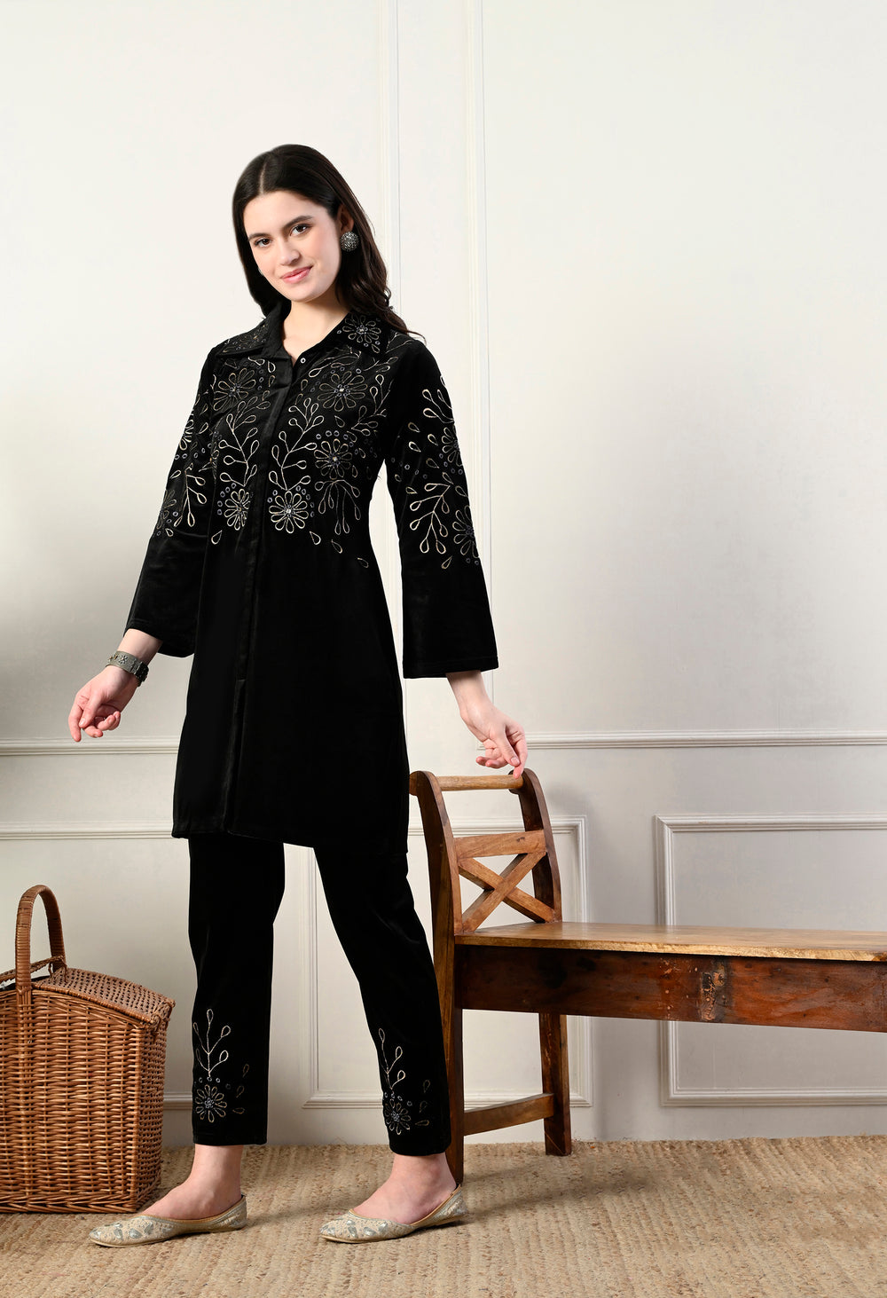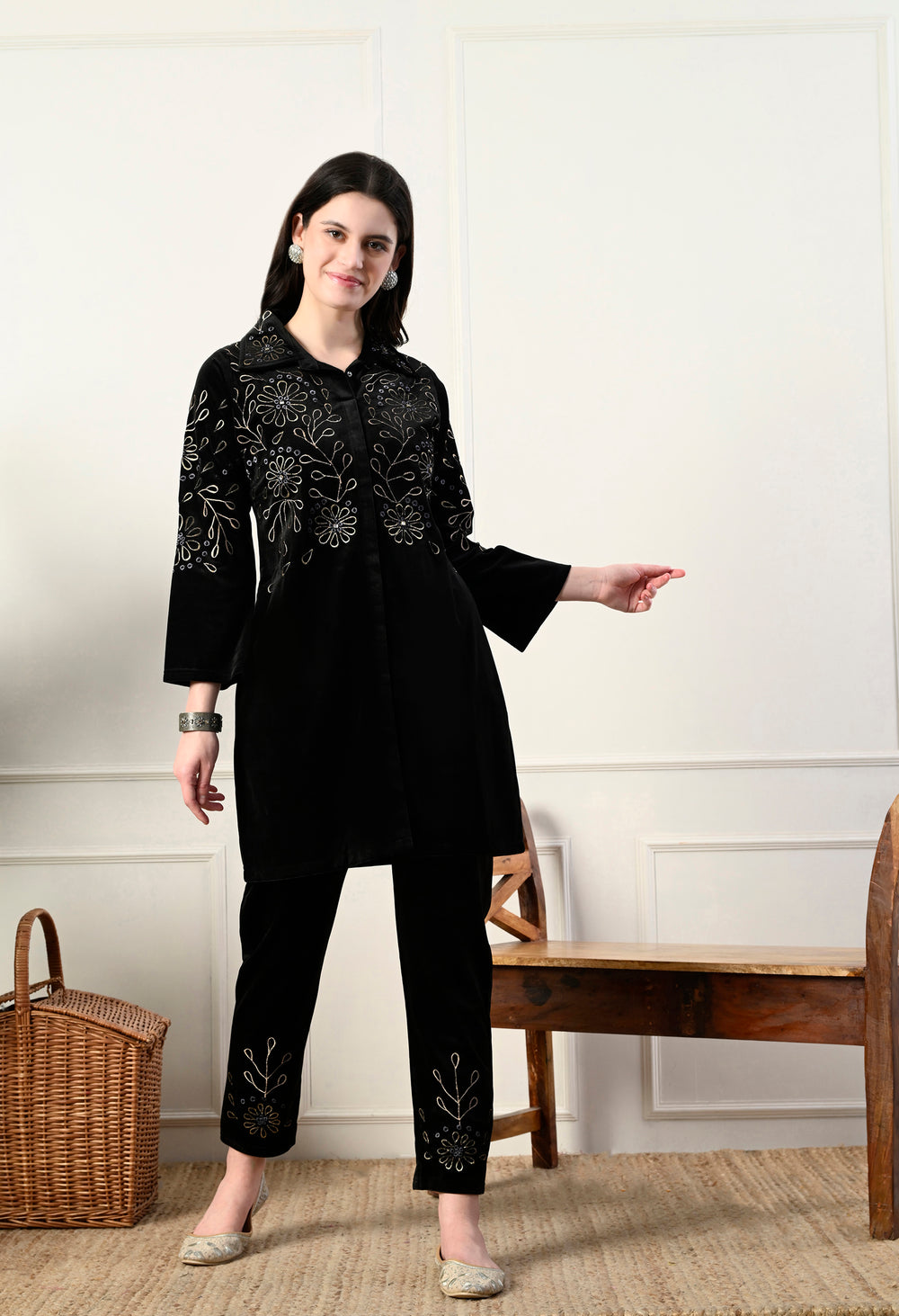 Indo-Western Black Embroidered 2 Piece Velvet Suit