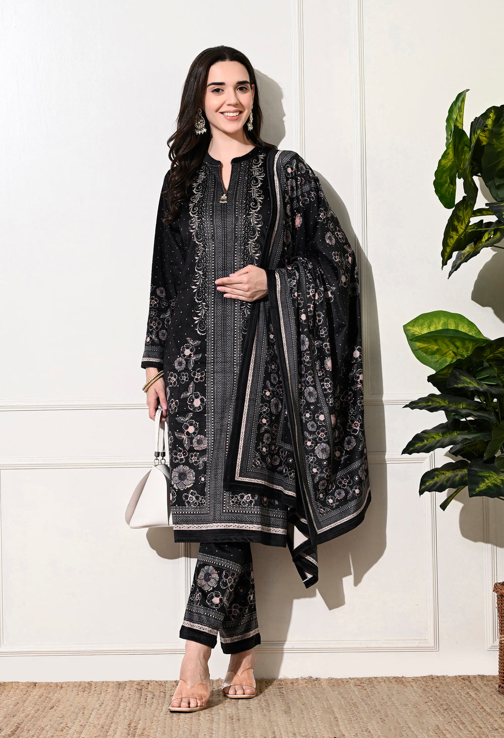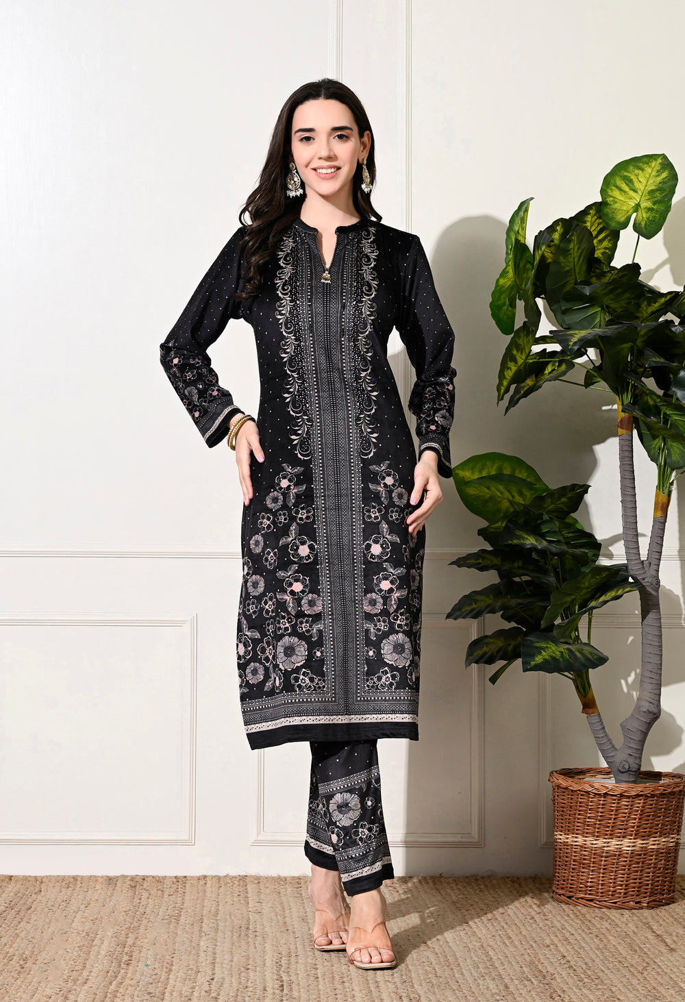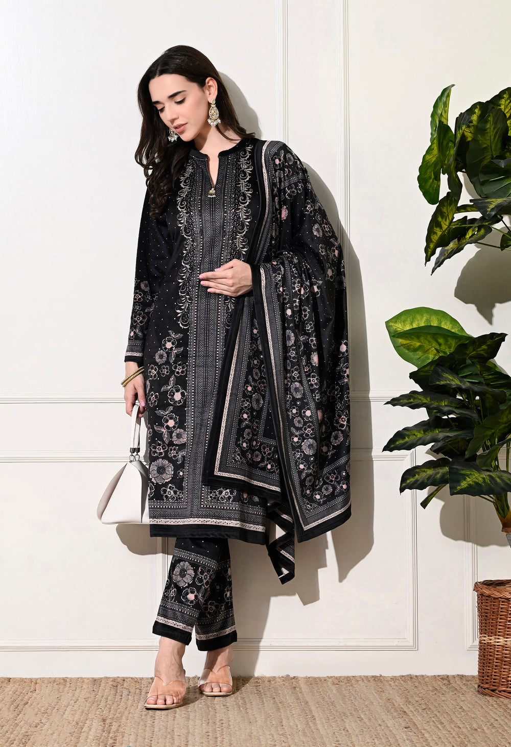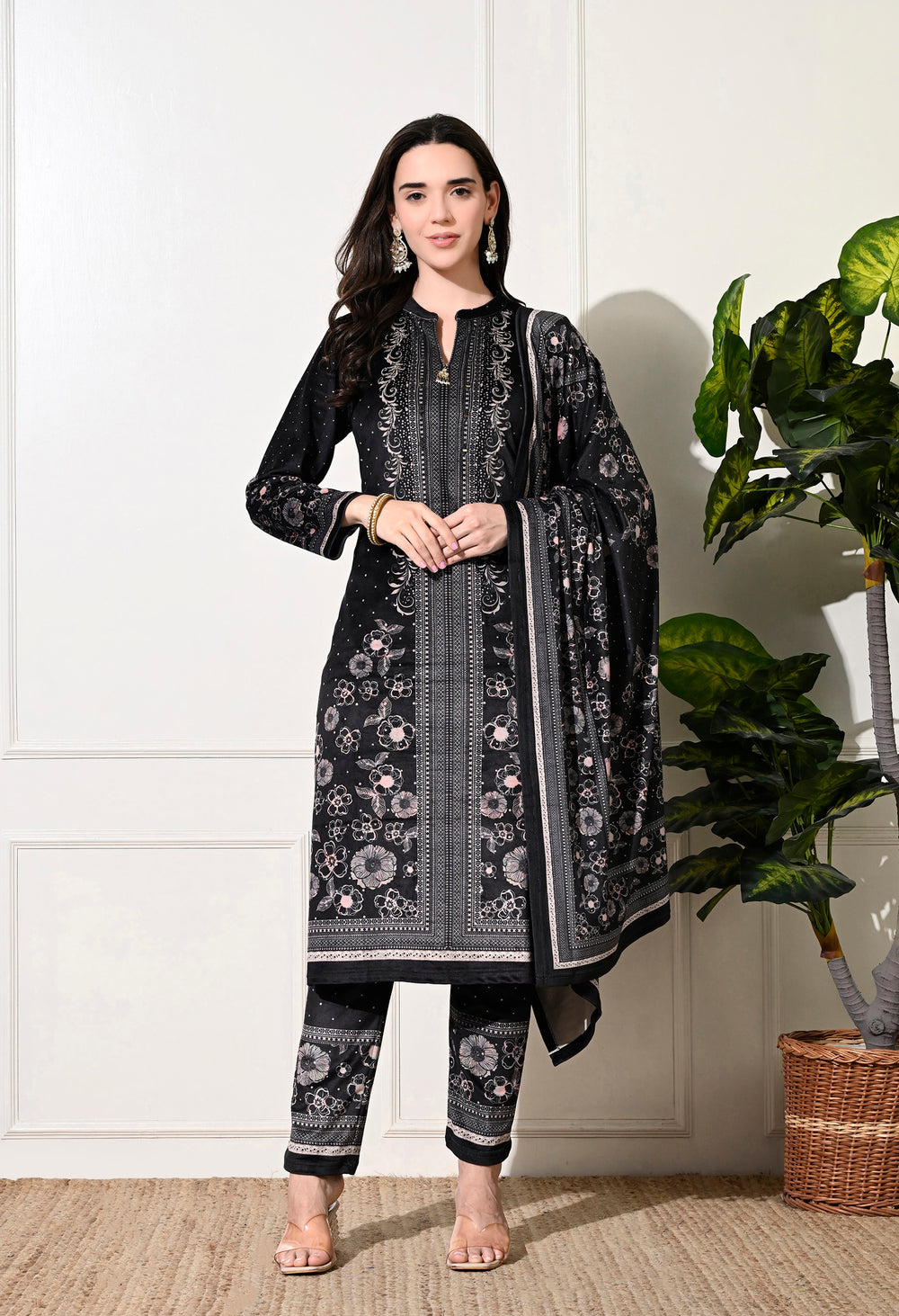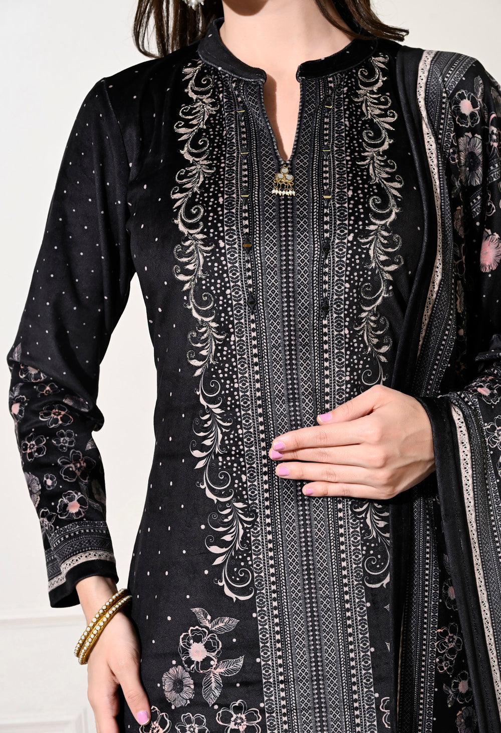 Luxurious velvet digital print suit featuring exquisite hand embroidery on the neckline. Includes a stunning digital print shawl and matching bottoms. Ideal for any occasion! Warm, soft, and stylish!