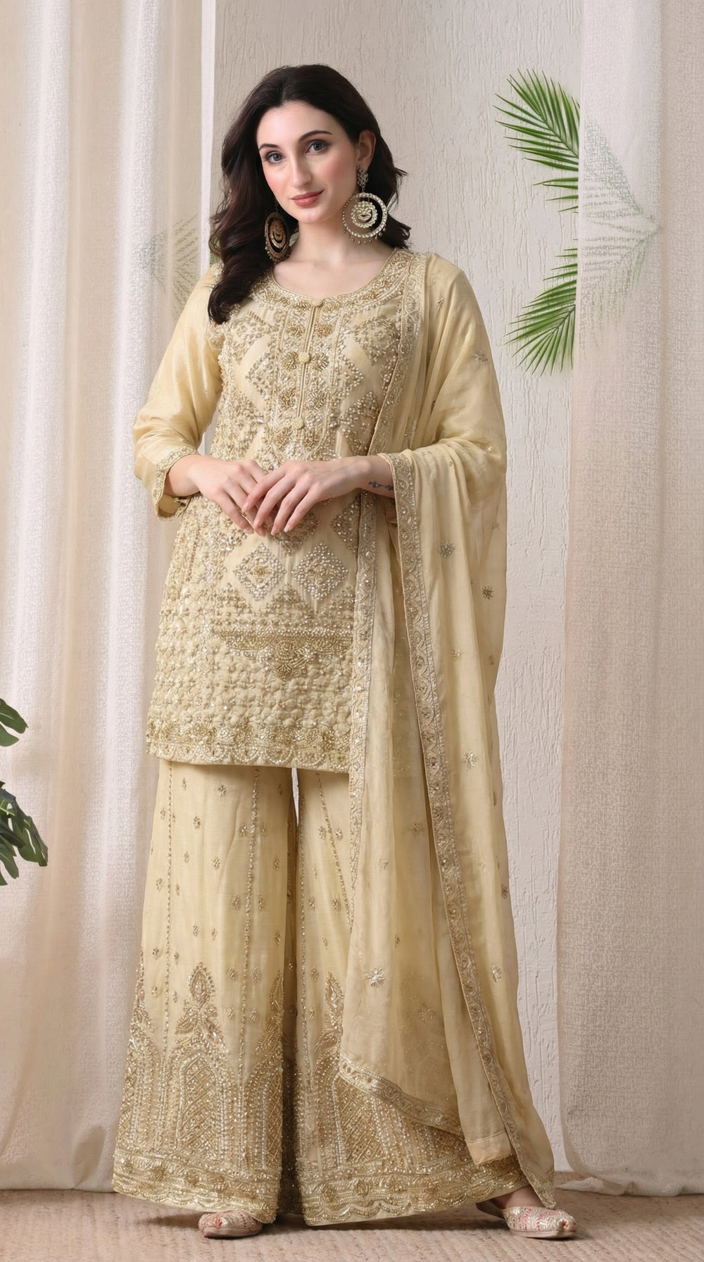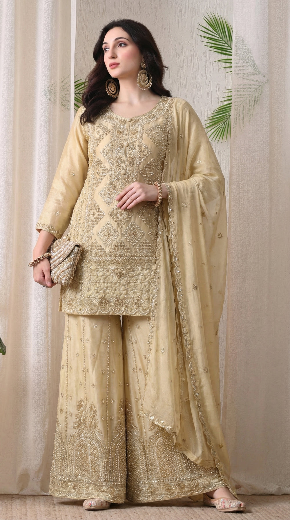 Beige Premium Silk Pearl, Bead, and Sequin Embroidered Sharara Suit- Set of 3