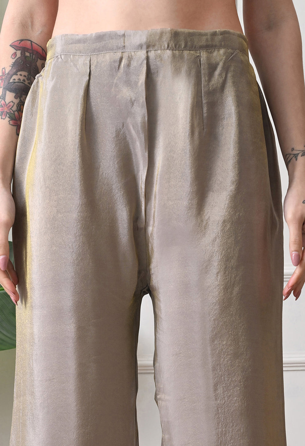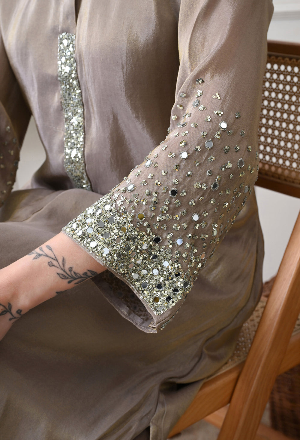 Description Glow with modern sophistication in this Beige Tissue Silk set. The kurta features a luxurious metallic sheen and a band collar with a sequin-embellished placket running down the neckline. The sleeves are the highlight, adorned with heavy, intricate silver sequin work at the cuffs. Paired with relaxed, matching straight pants, this outfit is a choice for evening parties and festive dinners.