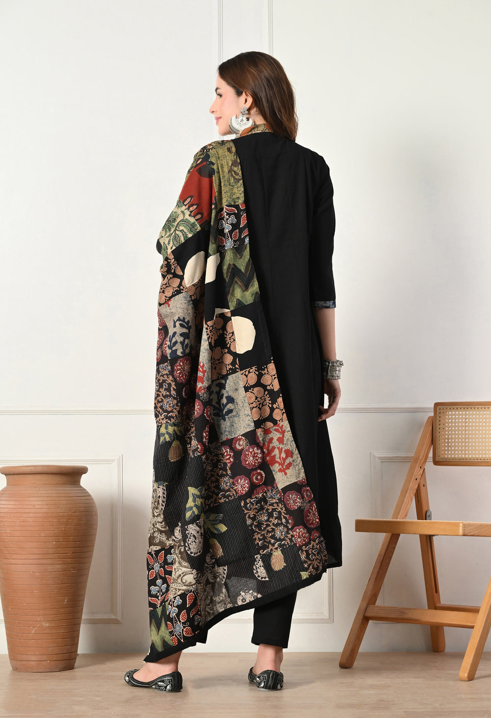 Paired with a patchwork dupatta, this ensemble is both stylish and smart. Crafted from comfortable cotton fabric, it's perfect for daily wear, casual gatherings, or festive occasions, ensuring you look great and feel great too.