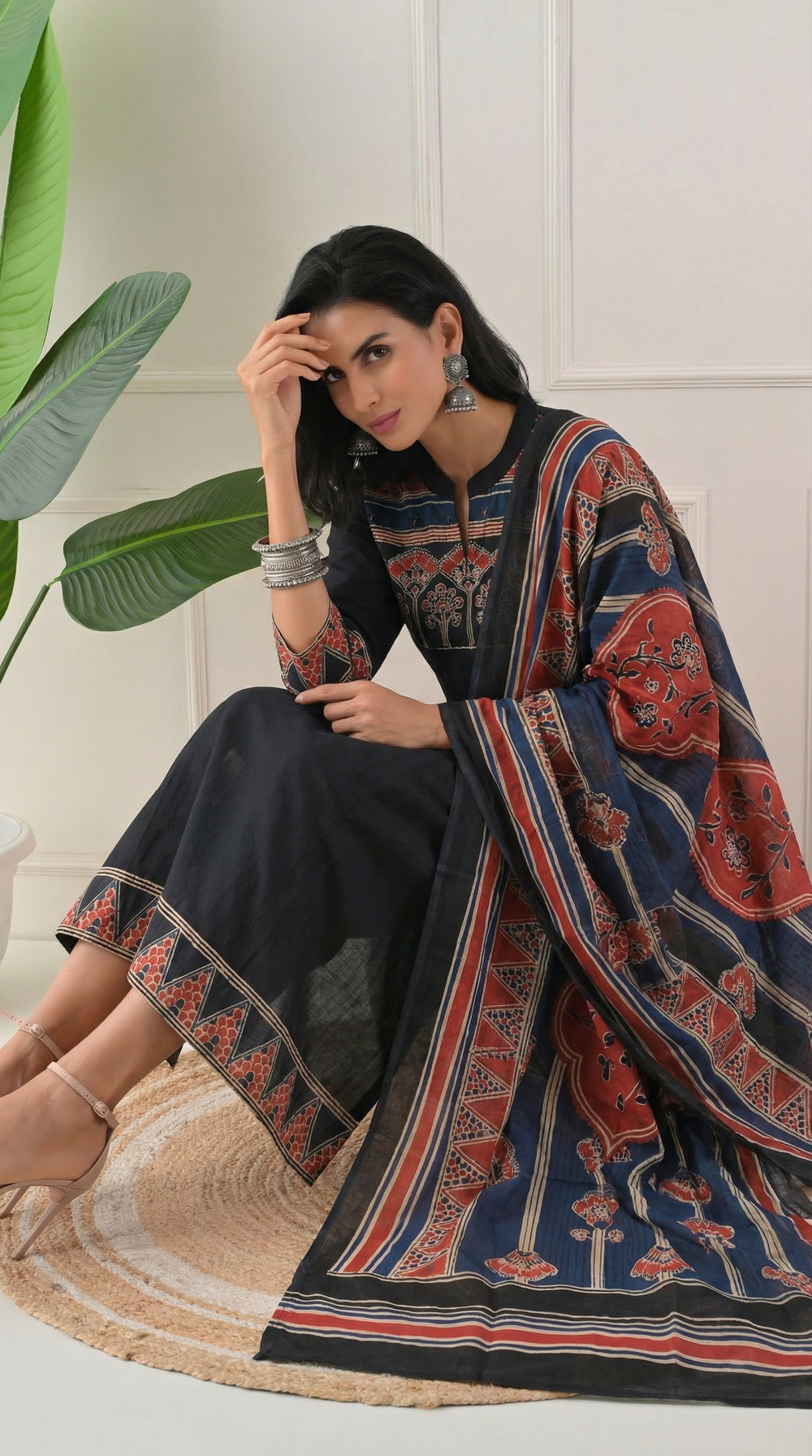 Black Cotton A-Line Suit with Ajrakh Print Dupatta- Set of 3