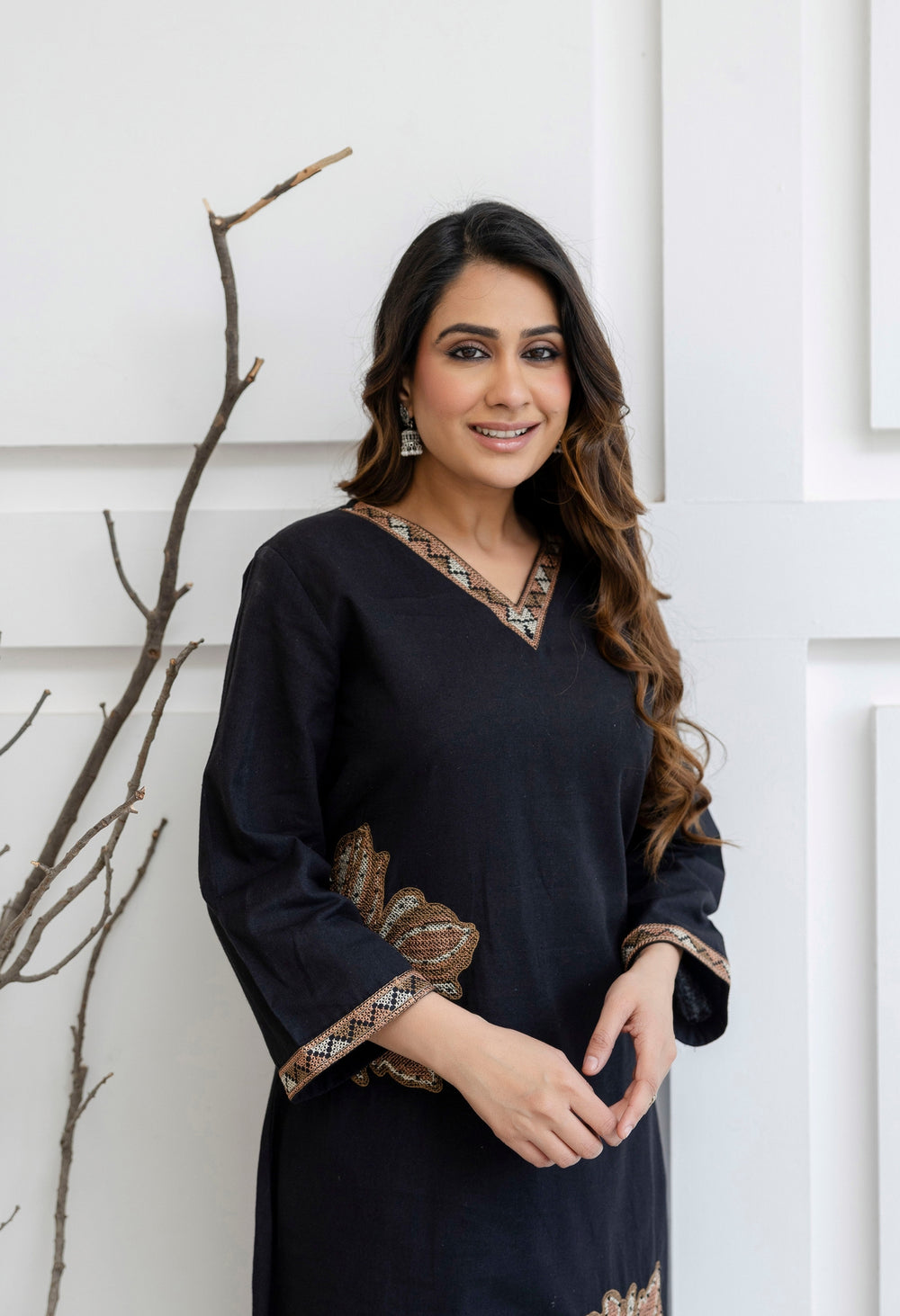 Black Cotton Cross Stitch Embroidery Kurta with Pants -Set of 2