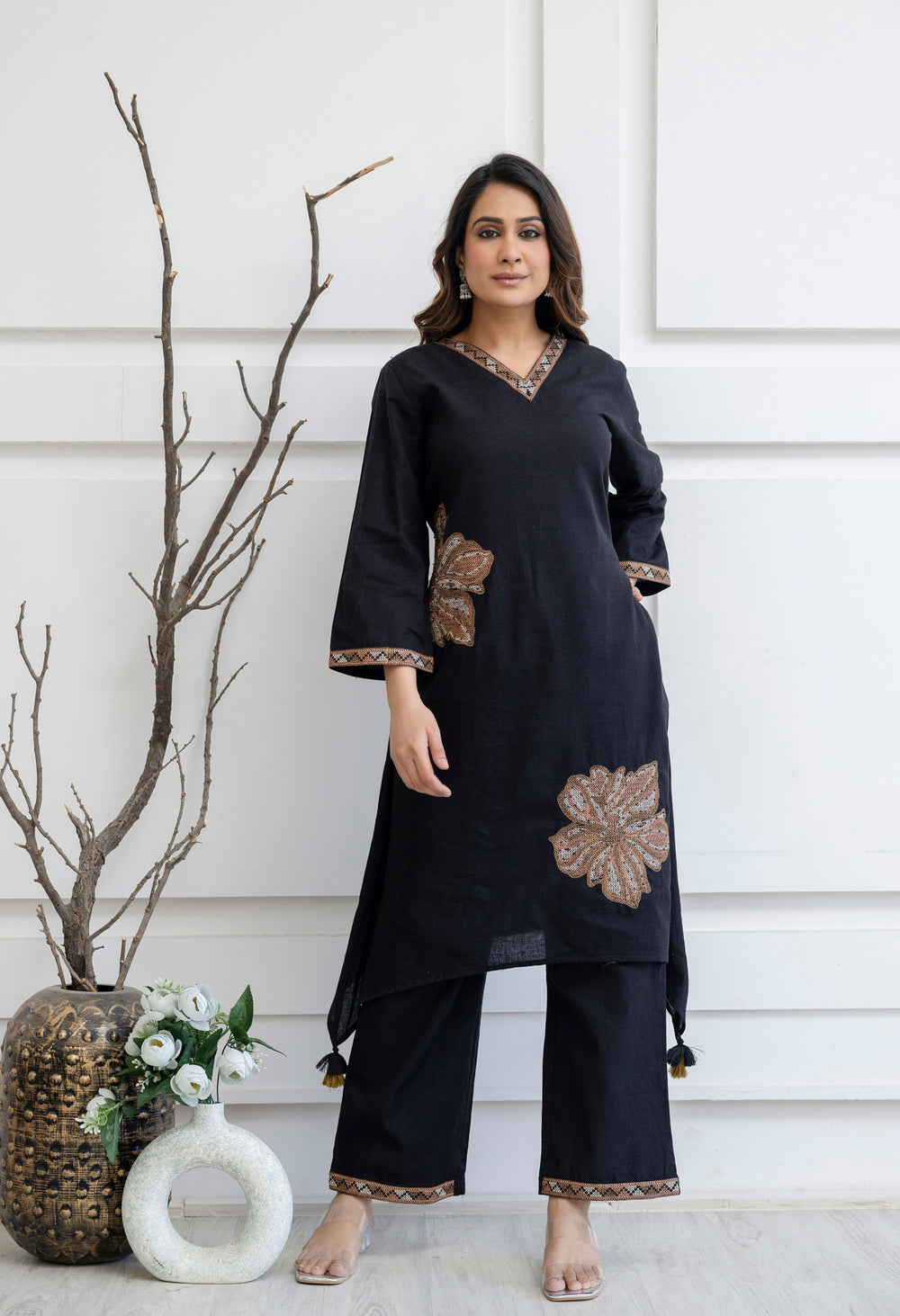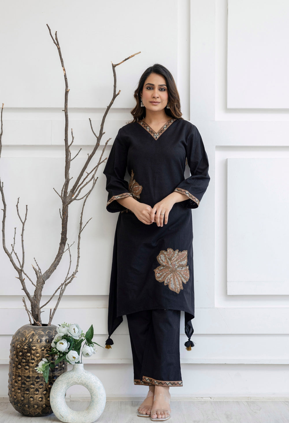 Black Cotton Cross Stitch Embroidery Kurta with Pants -Set of 2