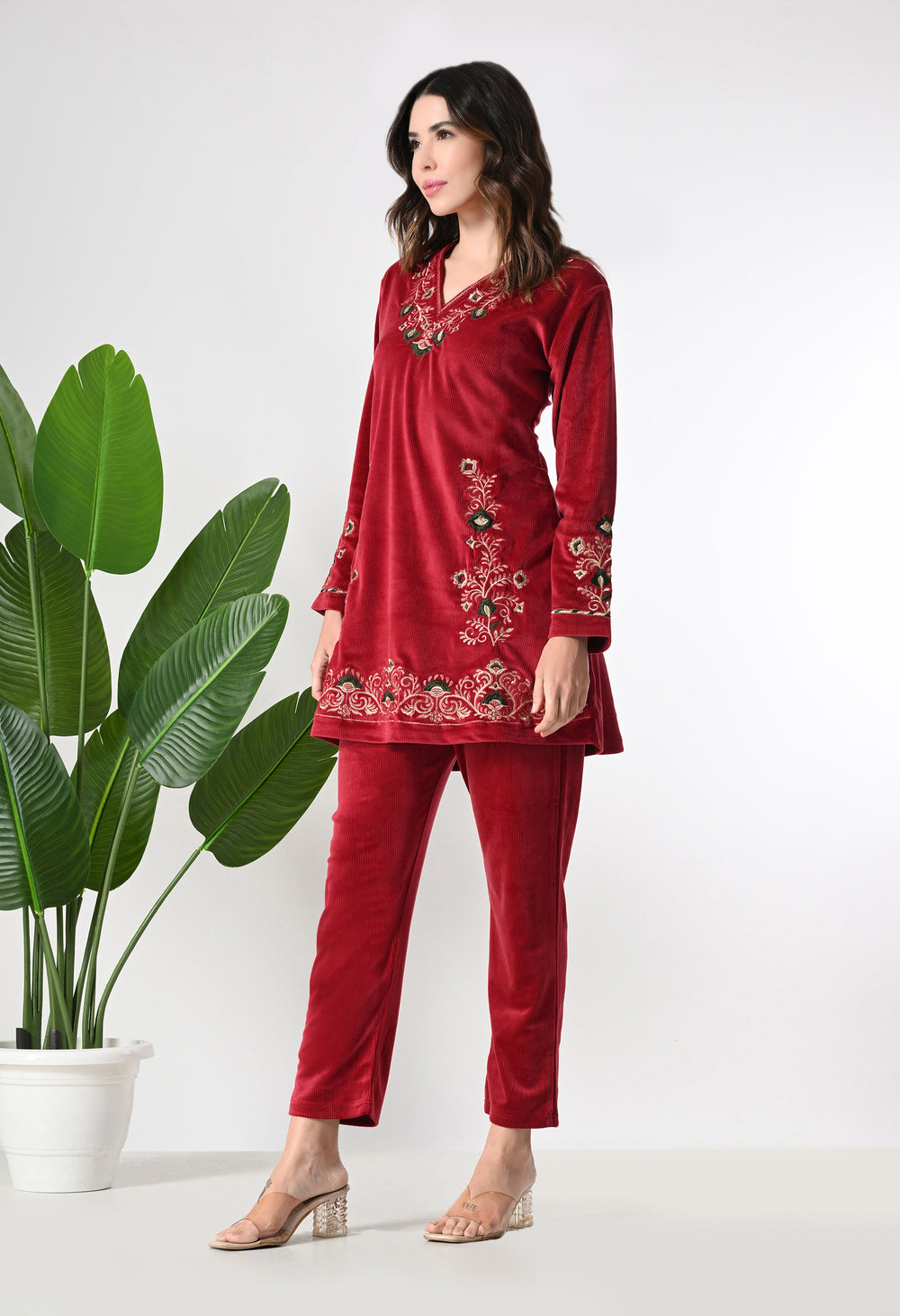 Red Velvet Coord Set with Beautiful Thread and Zari Embroidery- Set of 2