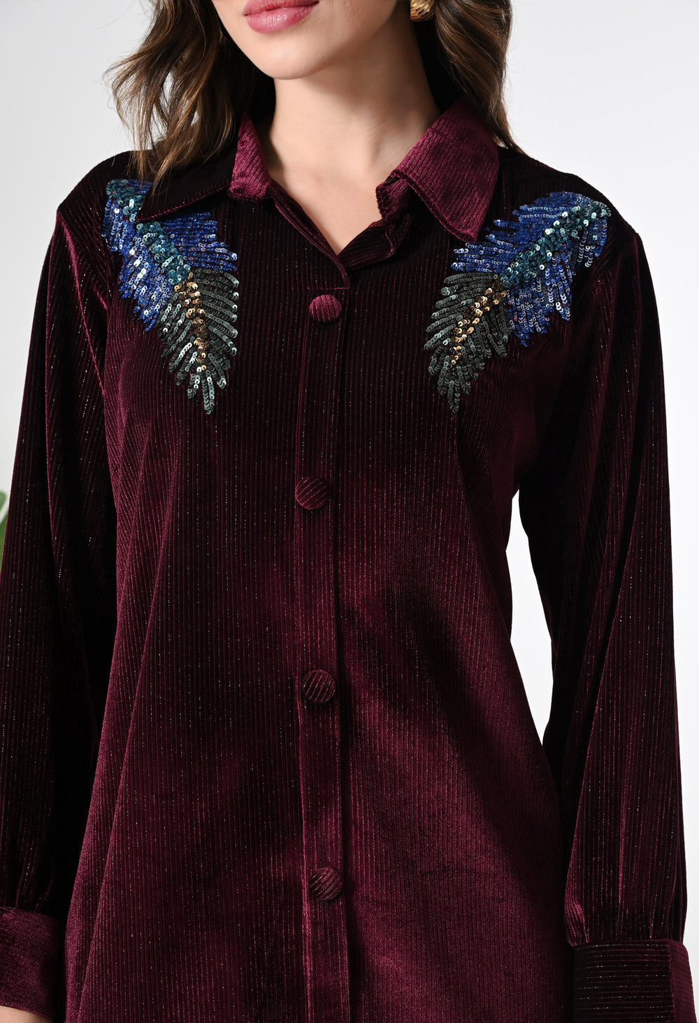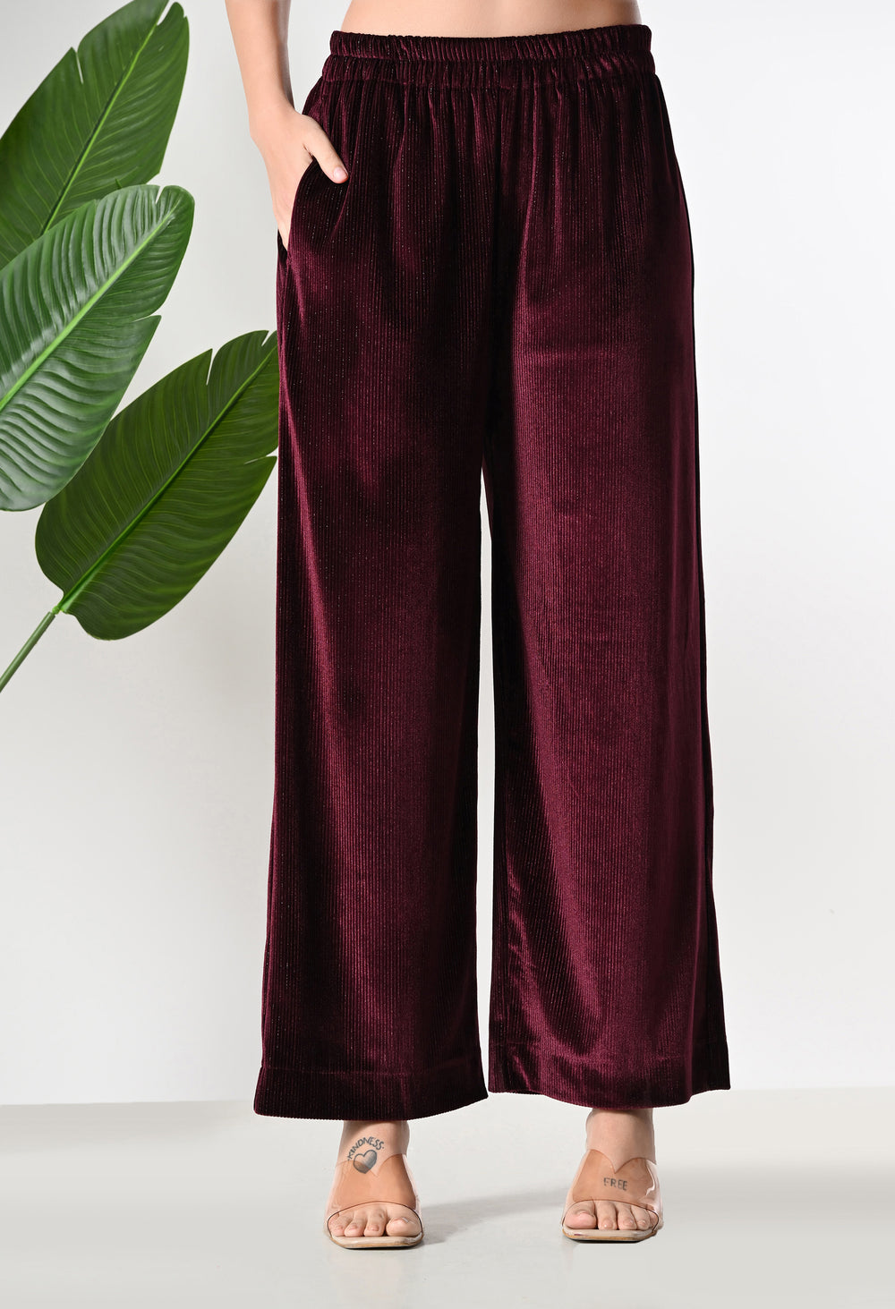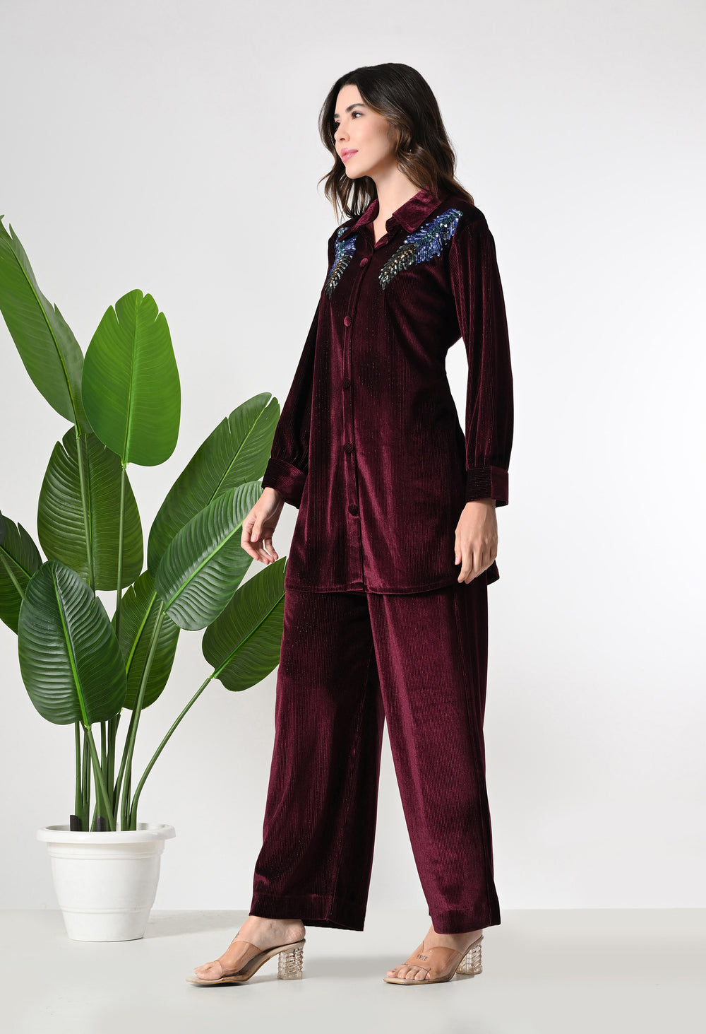Maroon Shimmer Velvet Co-ord set with Sequence Work paired with Smart Pants -Set of 2