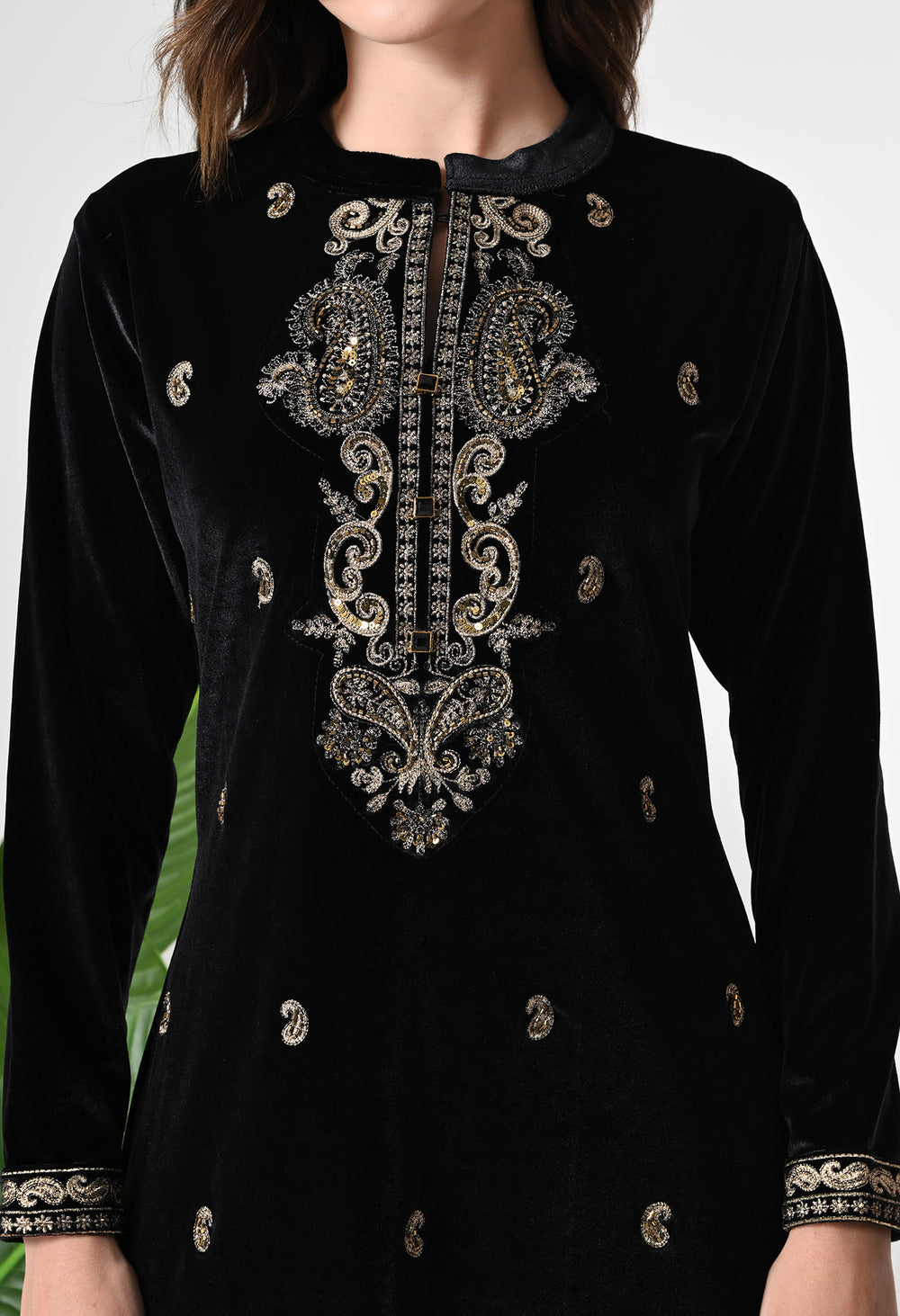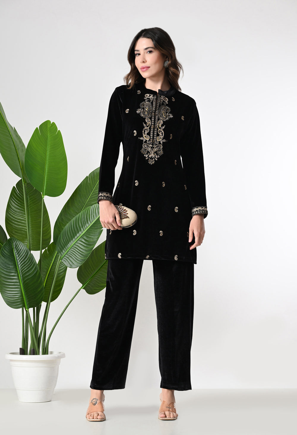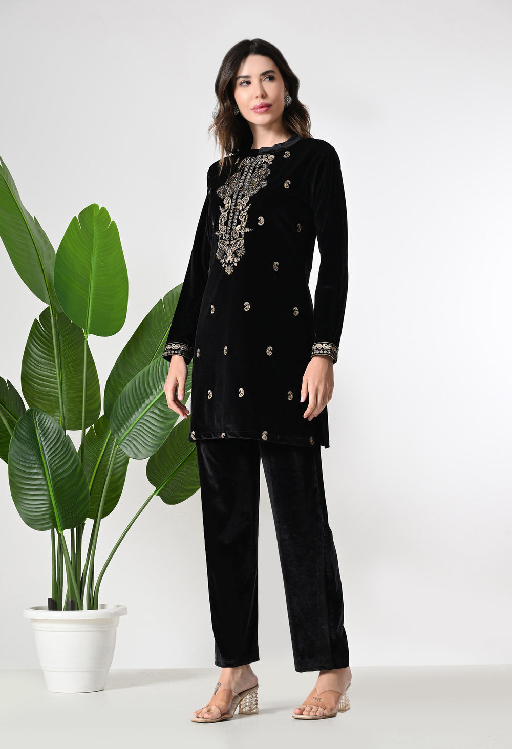 Black velvet co-ord set with beautiful zari sequence and cutdana work on the neckline, sleeves, and booti all over the kurta, paired with smart pants. The fabric is super soft and comfortable.