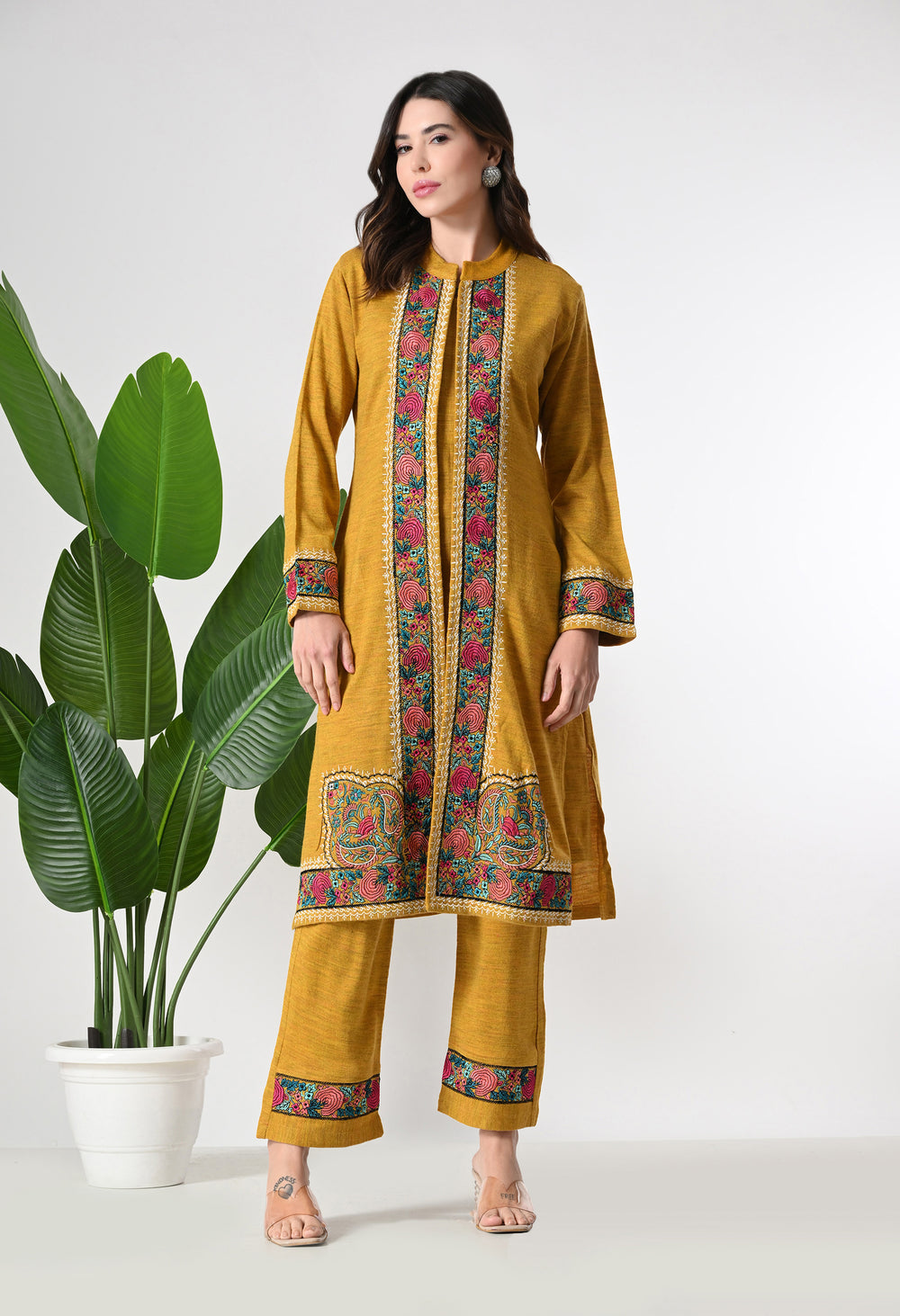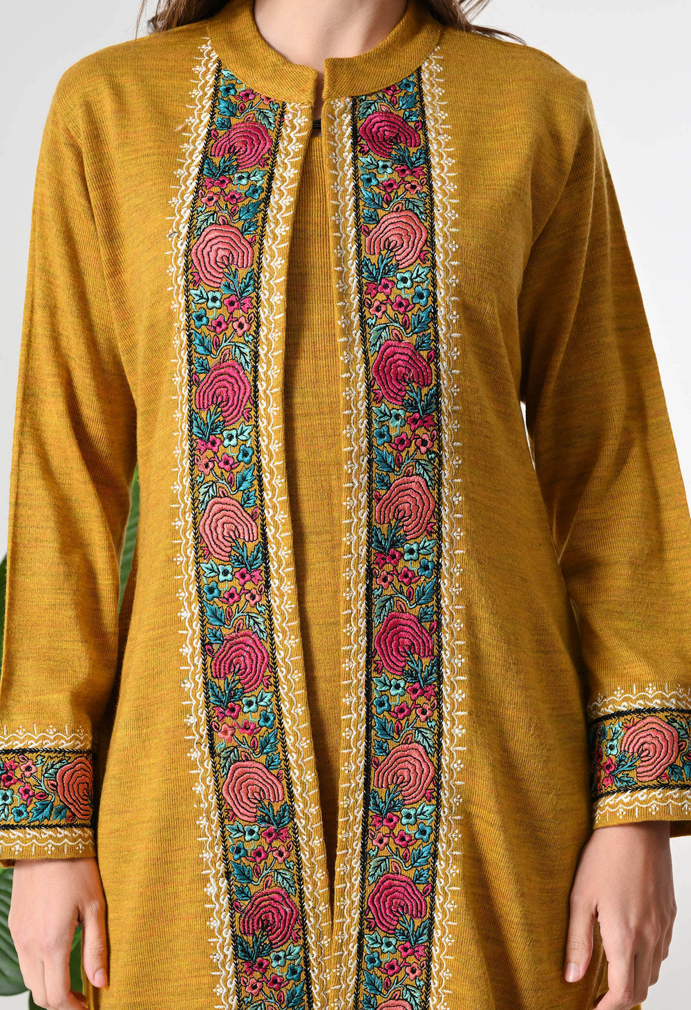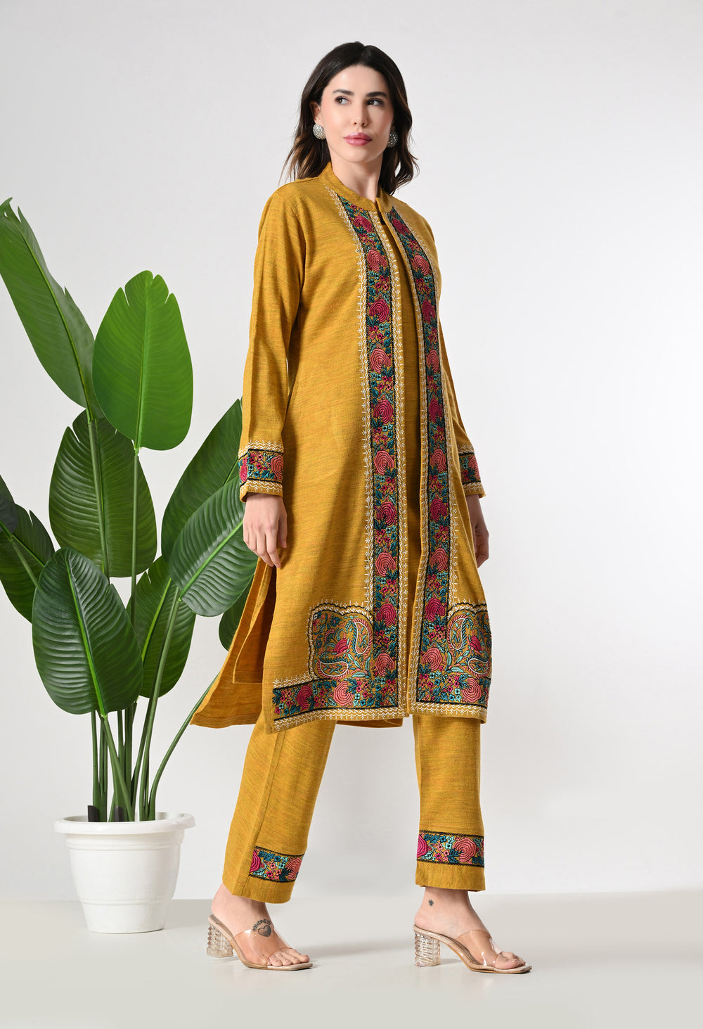 Mustard Woolen set with Detachable Kashmiri Embroidered Jacket - Set of 3