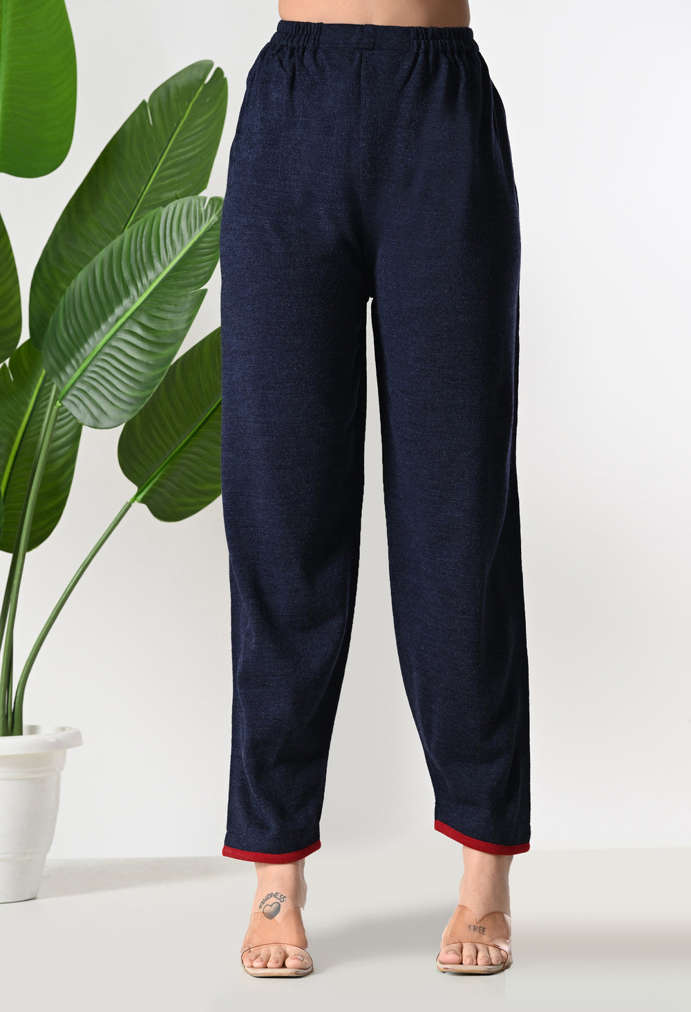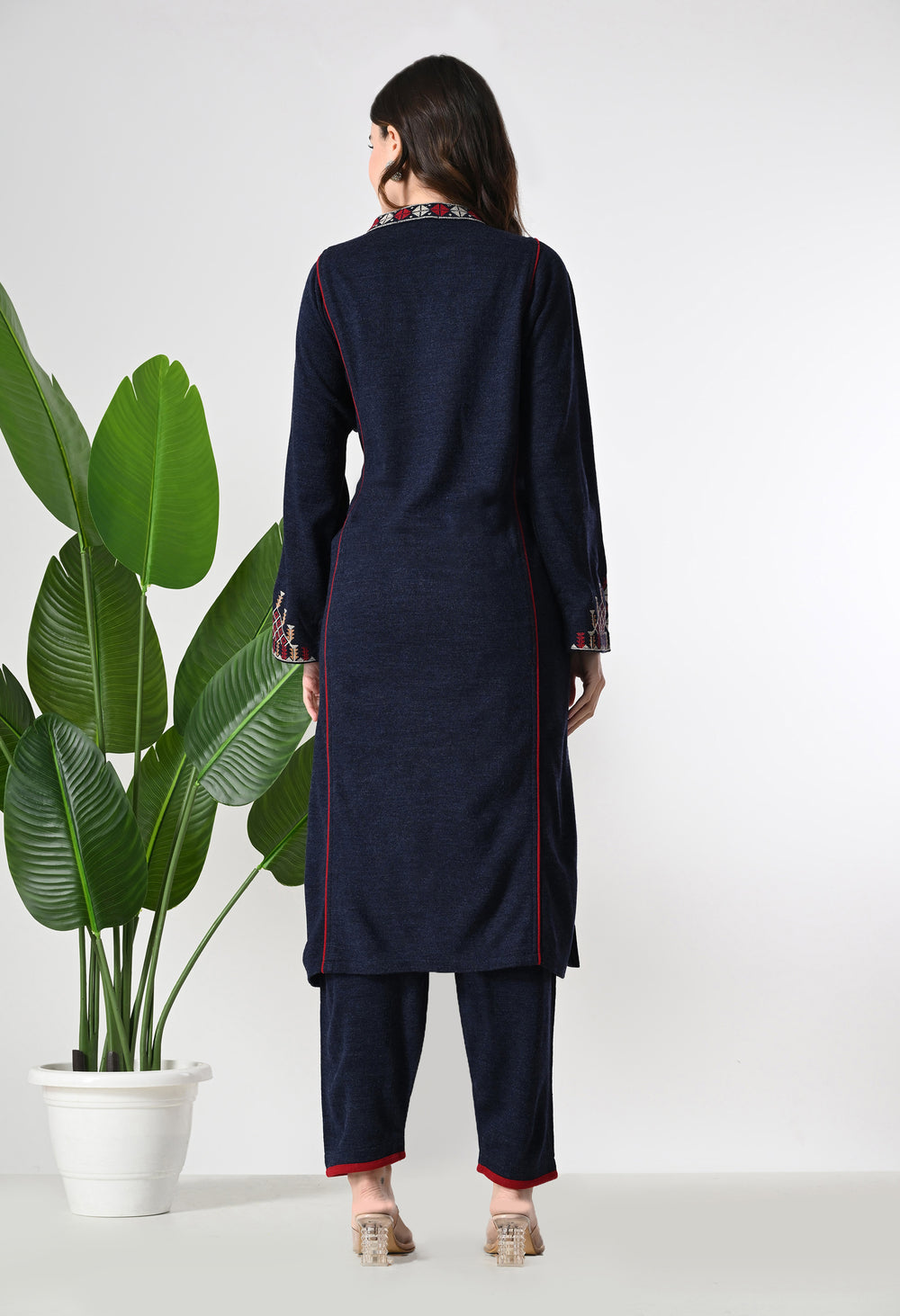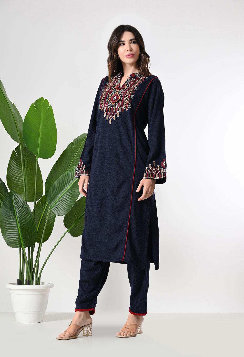 This navy blue, pure wool two-piece set features elegant Kashmiri embroidery on the neckline and sleeves, paired with stylish wool pants. It offers a comfortable yet fashionable look. The fabric is made from pure wool, ensuring warmth and softness.