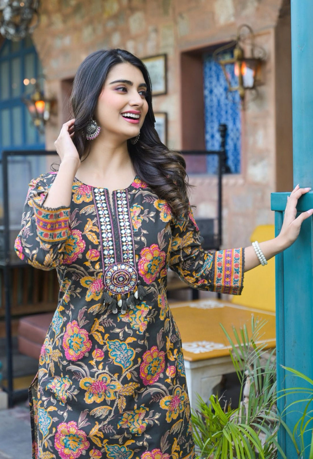 Summer-friendly pure cotton 2-piece set with beautiful tassels and embroidery on the neckline and lace detailing. The set includes a kurta paired with palazzo pants. Smart and stylish set and very comfortable to wear.