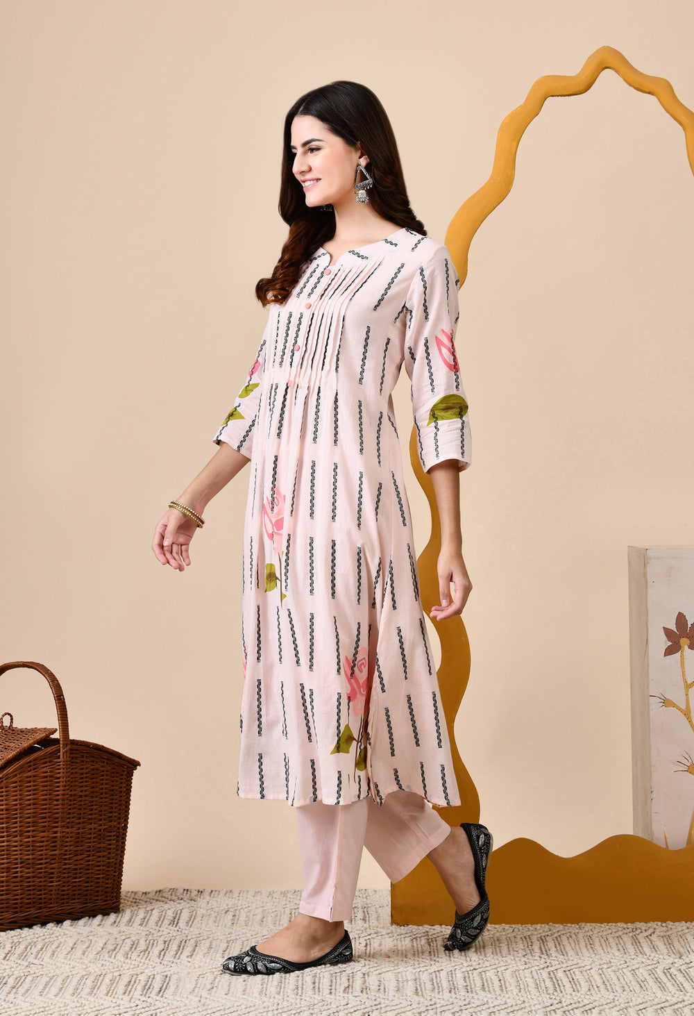 This set includes a hand-painted mul cotton kurta (with mul cotton lining attached) paired with smart pants. The beautiful printex and button detailing adds elegance to the neckline. Made from super soft pure mul cotton, this summer-friendly and breathable fabric is perfect for all occasions. The kurta also comes with a convenient pocket, making it both fashionable and functional.