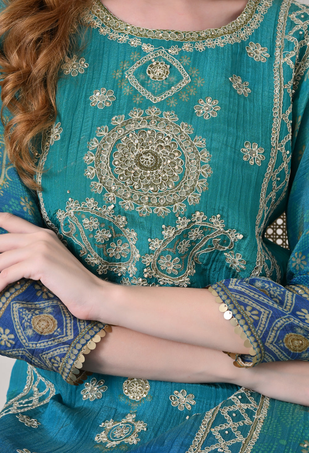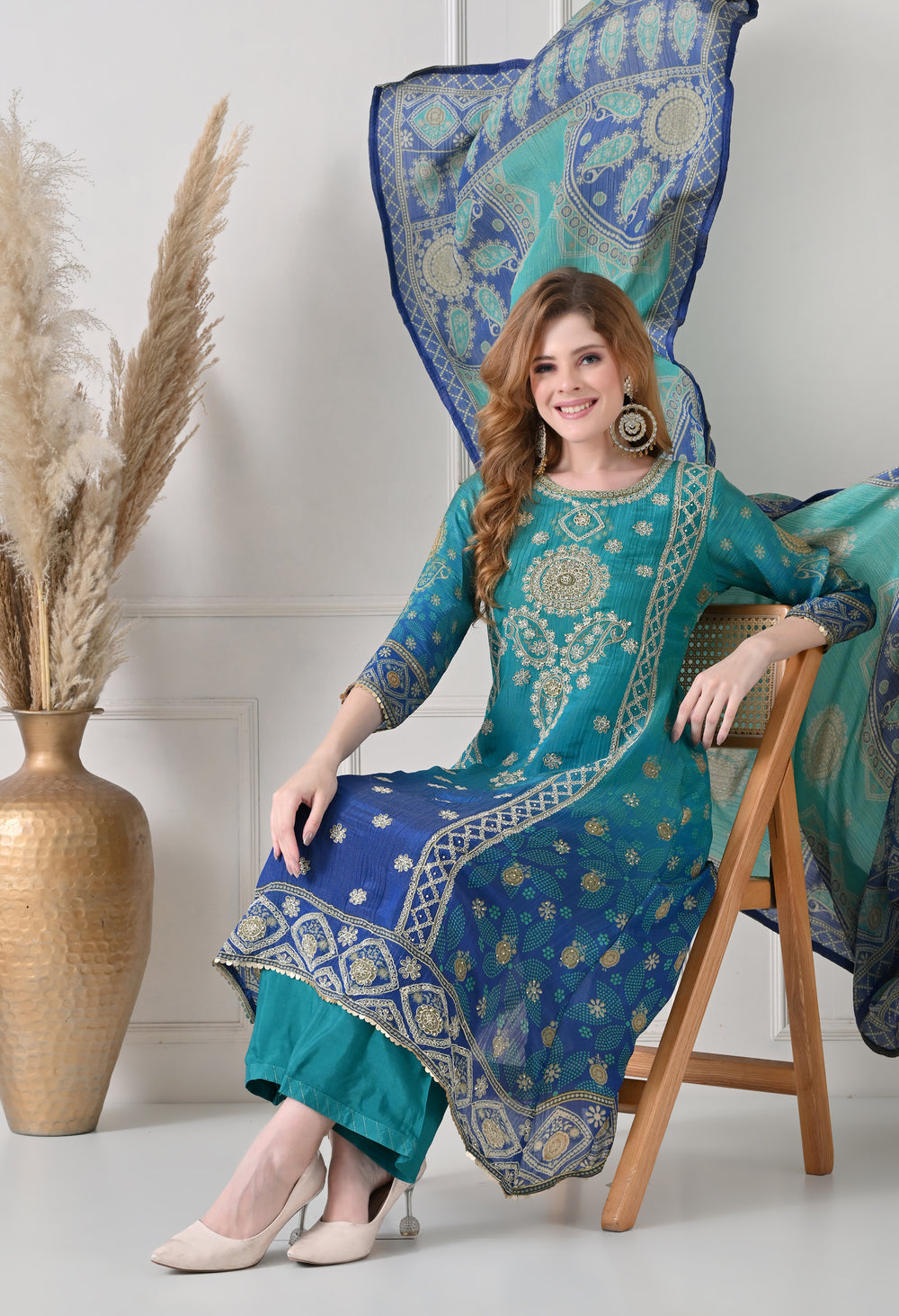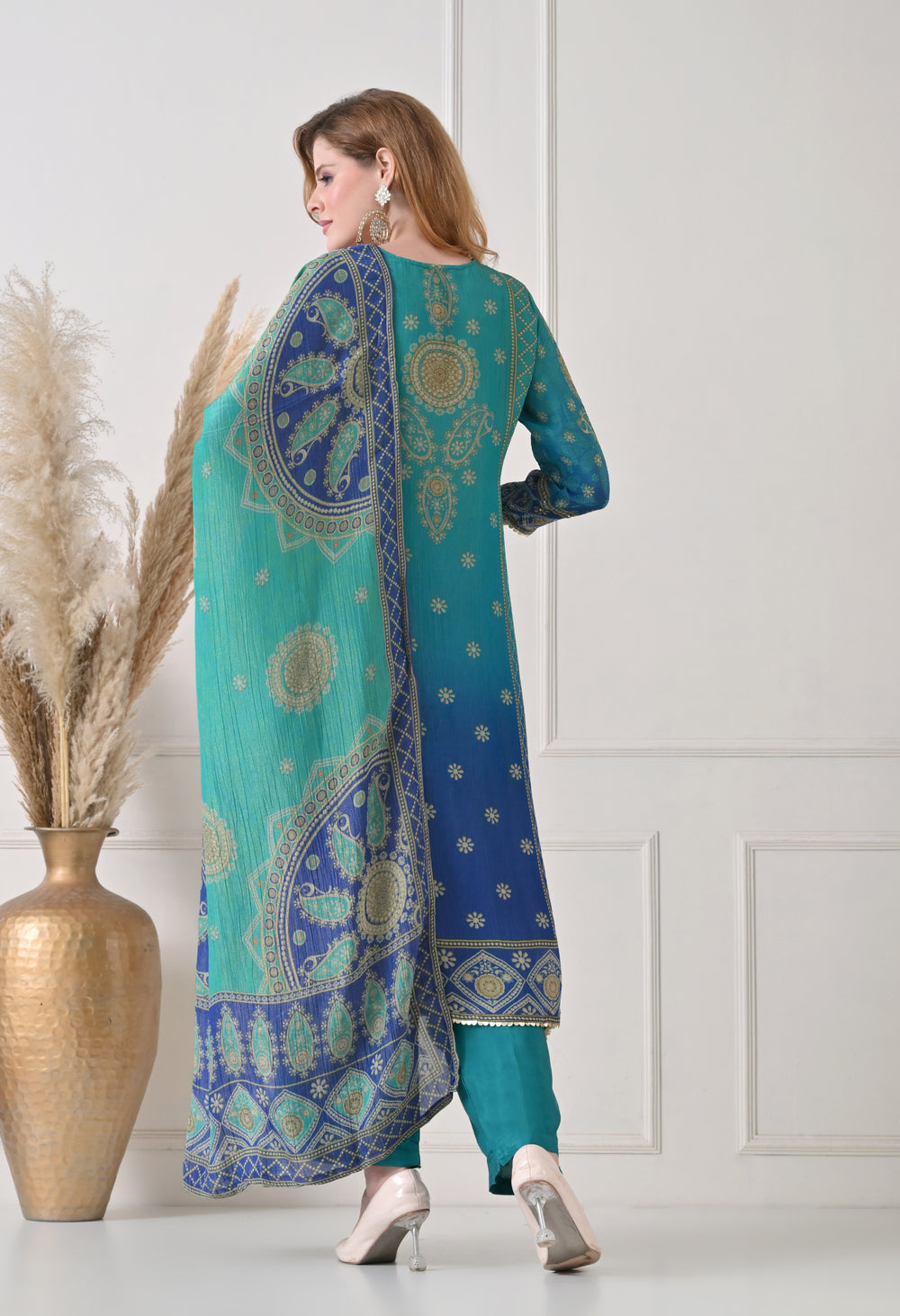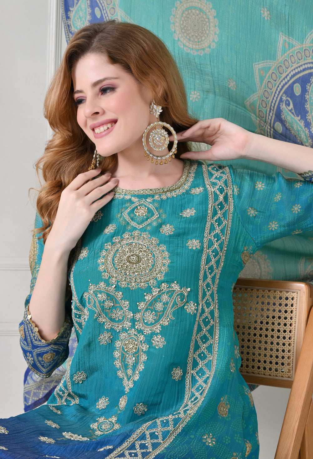 Blue Crush Tissue Zari Embroidered Suit - Set of 3