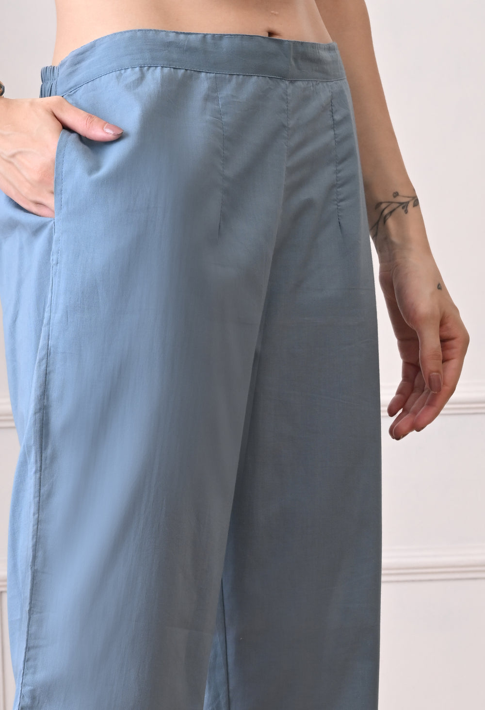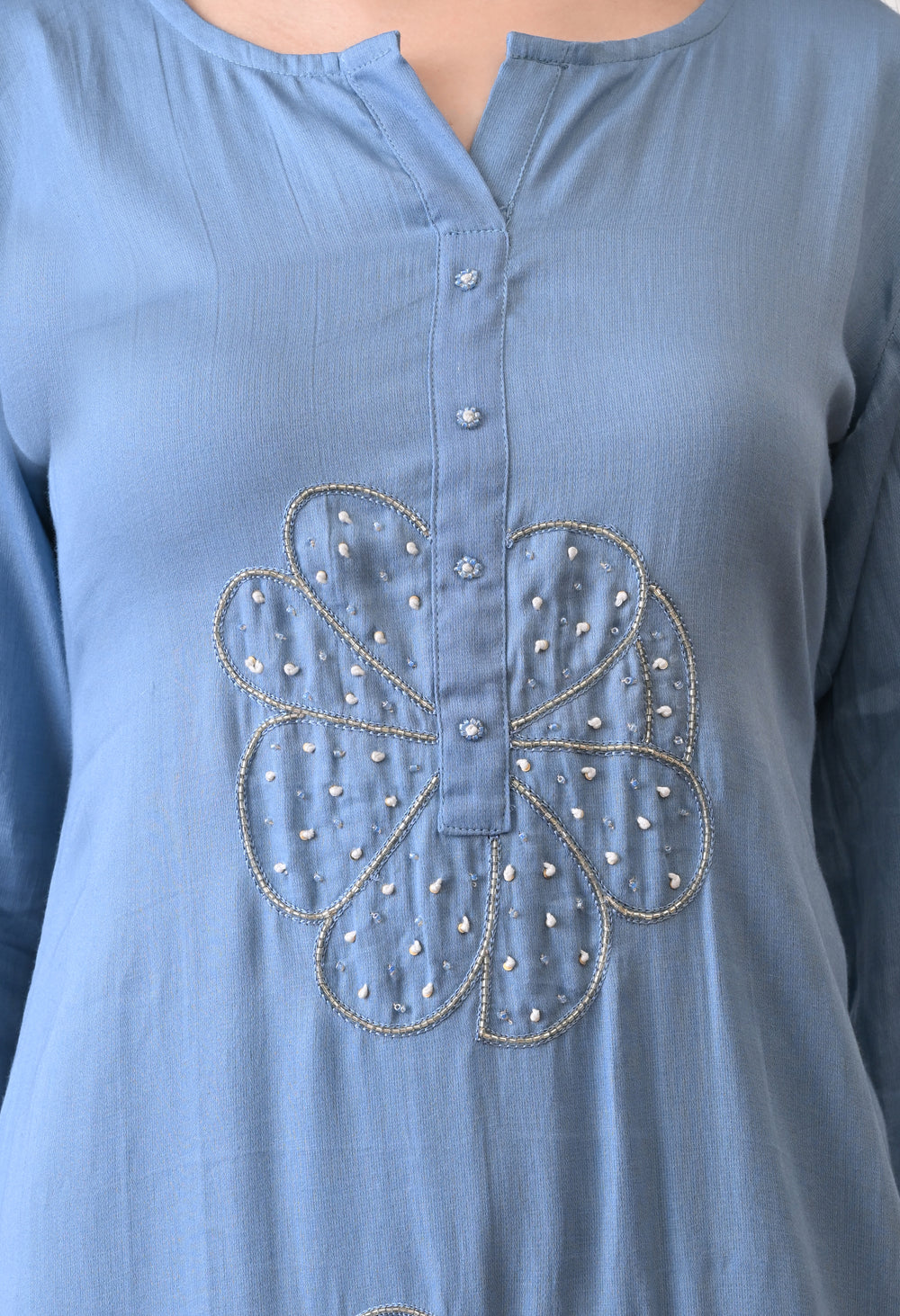 Blue Mul Chanderi Handwork Suit is a beautiful outfit with elegant handwork embroidery. It's very comfortable with super soft fabric. The set includes a hand-embroidered kurta, Kota Doria dupatta, and Palazzo pants. This outfit is great for all occasions like parties, gatherings, or festive events.