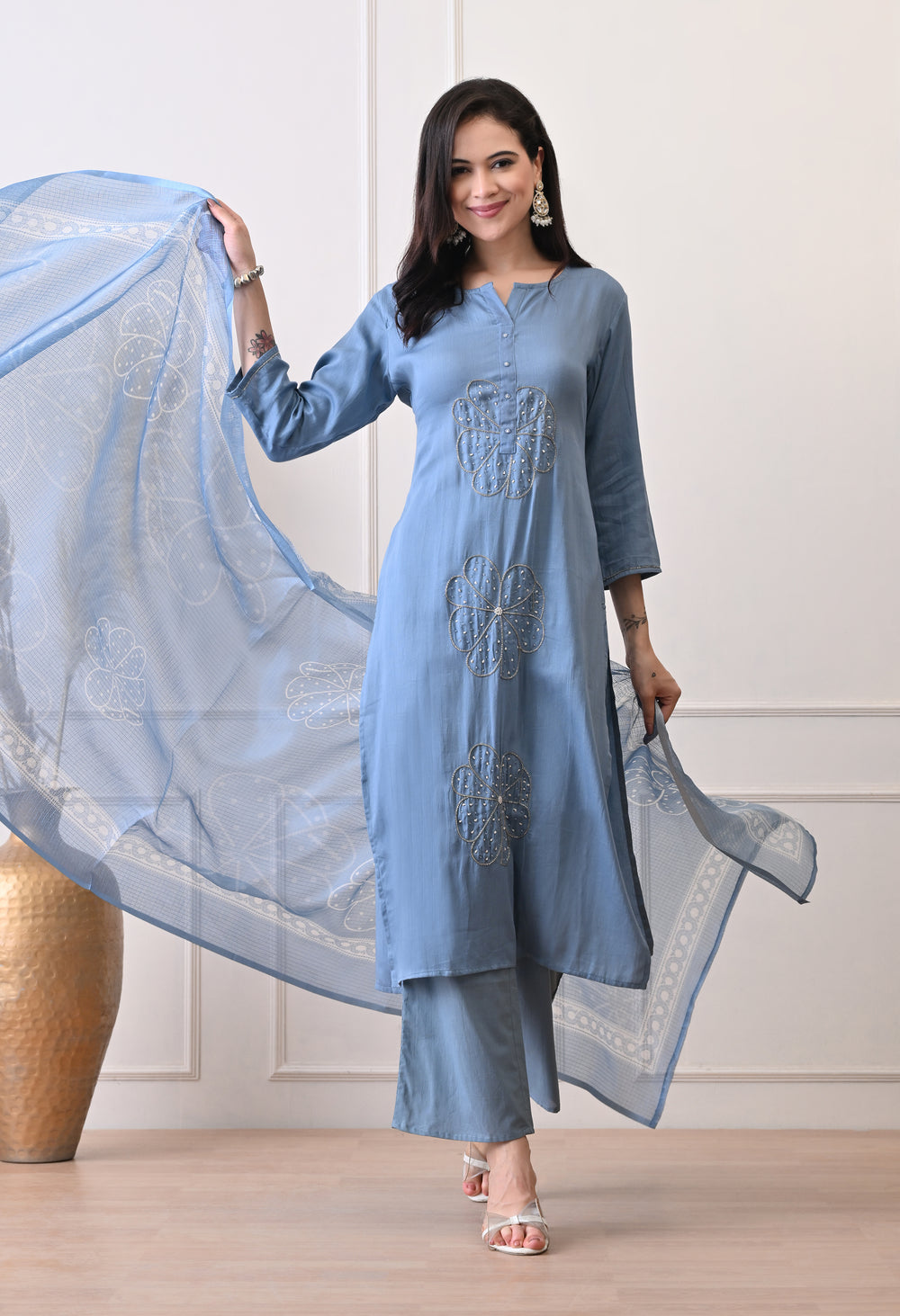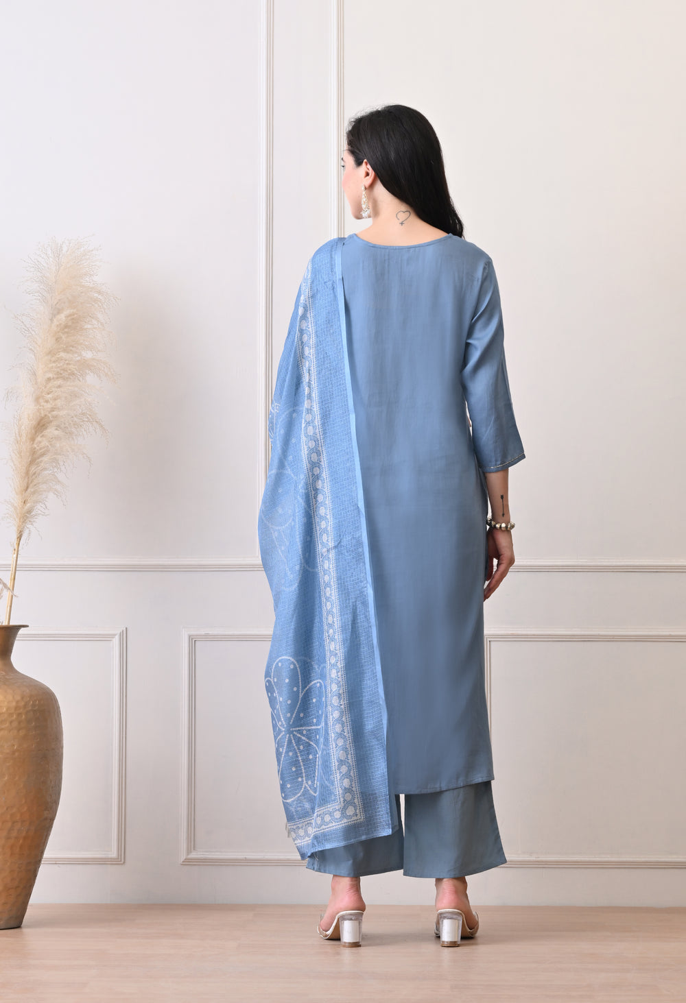 Blue Mul Chanderi Hand Embroidery Suit- Set of 3