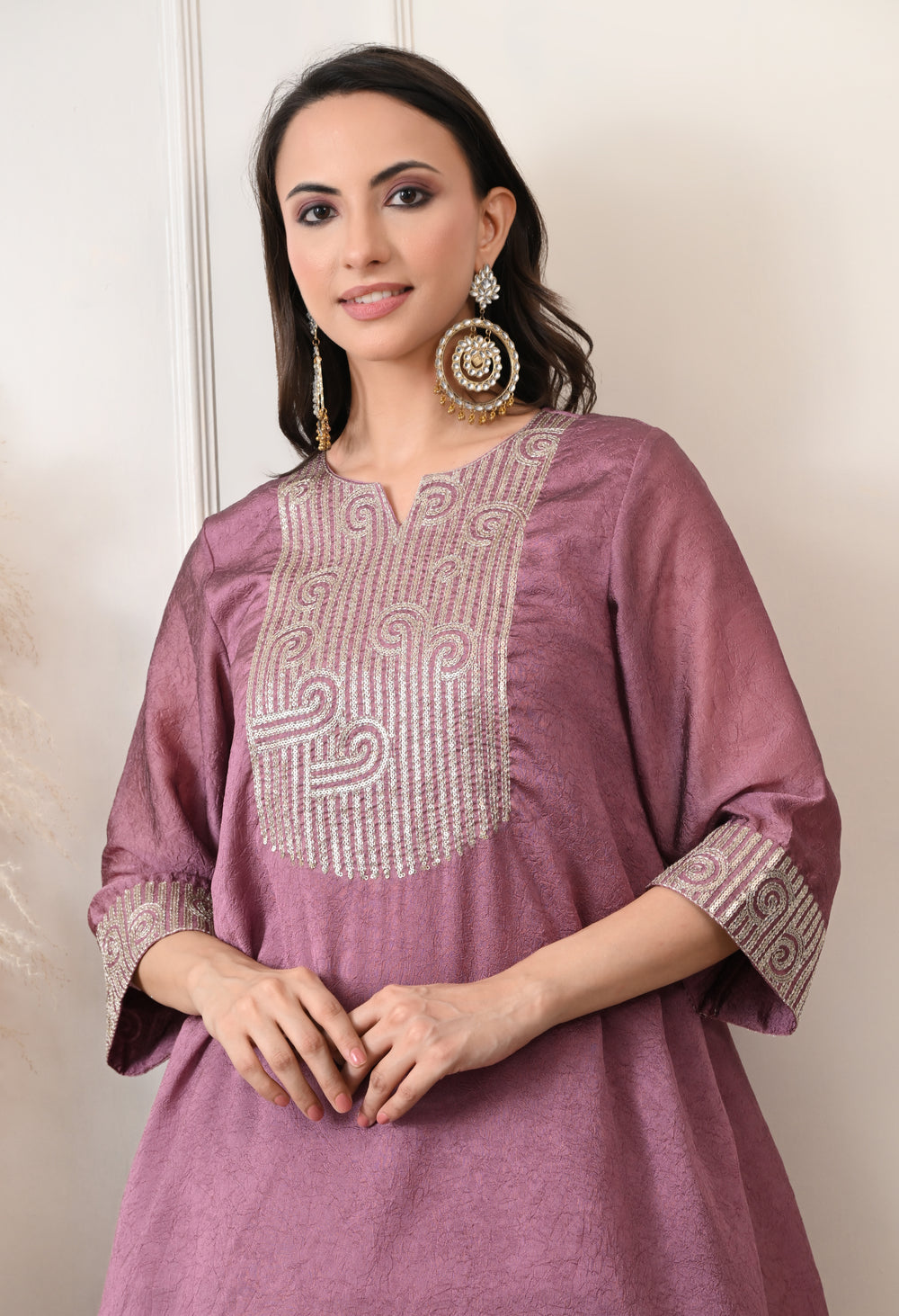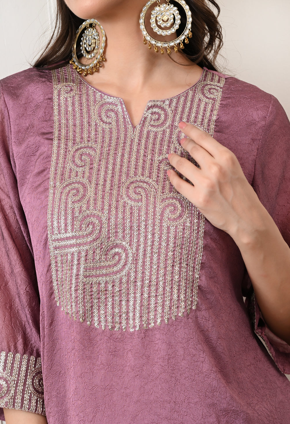 - Kurta: Features beautiful sequin work on the neckline and sleeves,