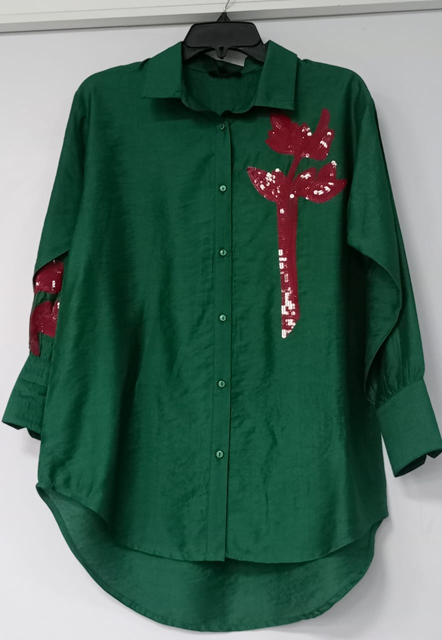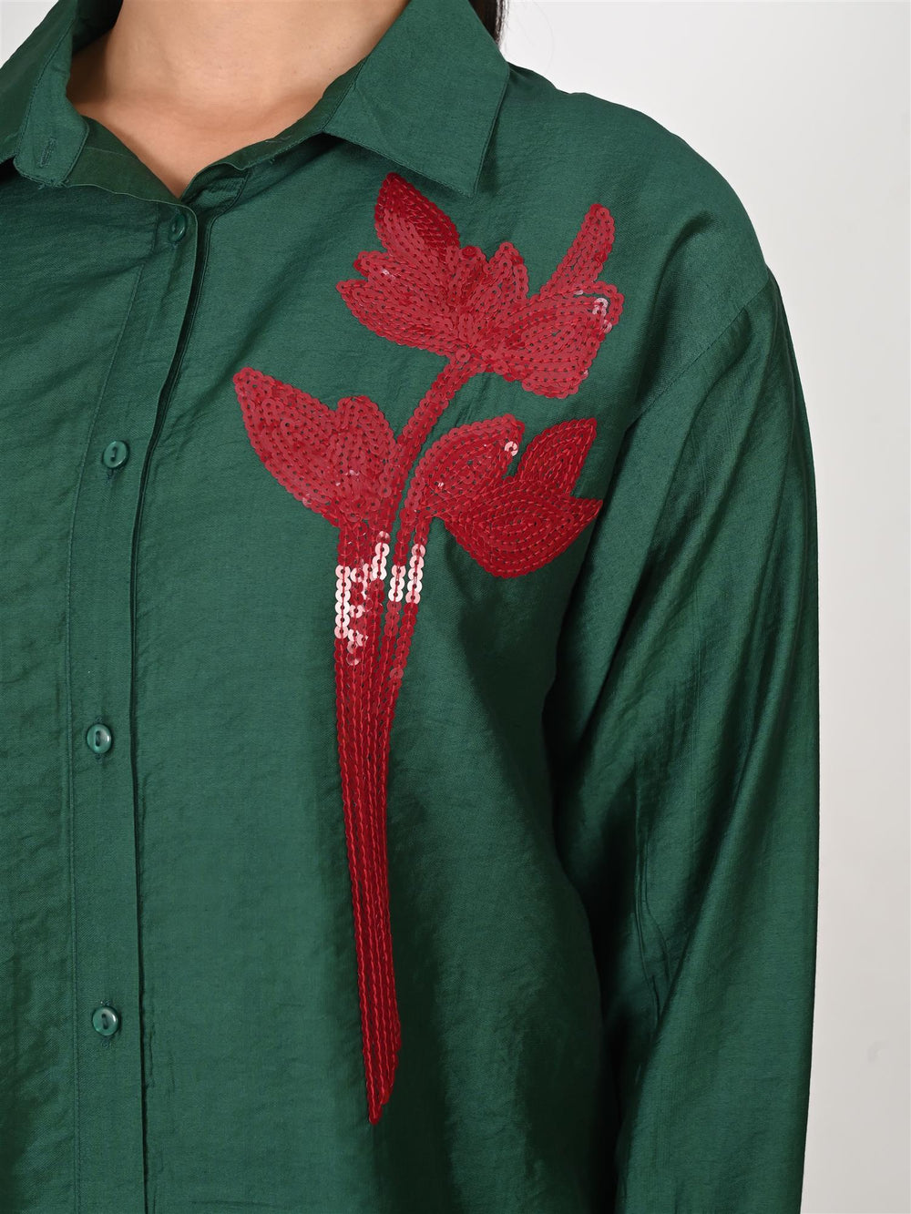 Make a statement with our bottle-green silk shirt, featuring a unique, hand-embroidered pattern in a rich maroon hue. The design flows elegantly from the collar down the front, with a matching detail on the cuff. Crafted from luxurious silk, this shirt offers a smooth feel and a polished finish, perfect for both casual outings and evening events.