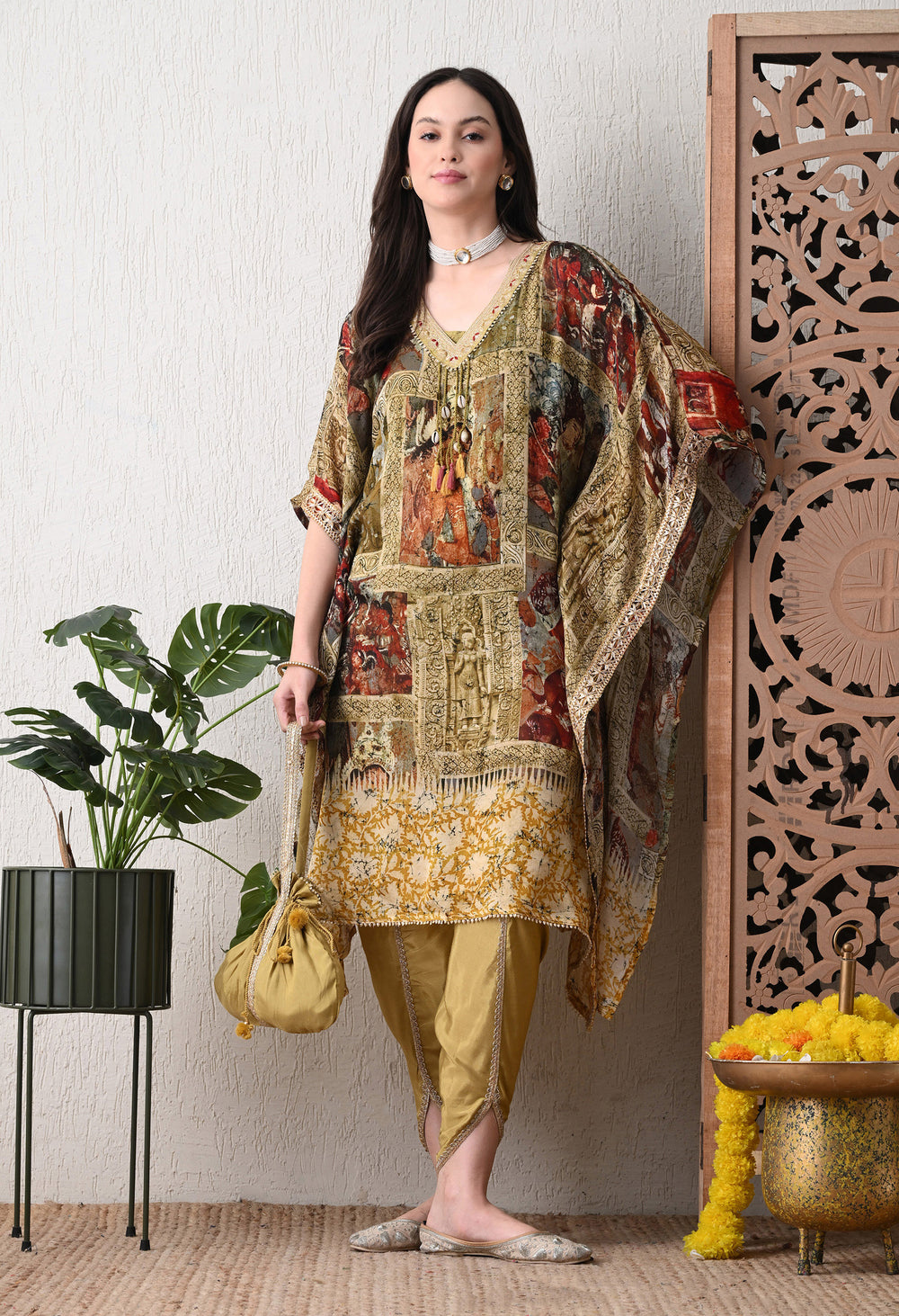 Brown Chinon Digital Print Kaftan with Tulip Pants and Potli - Set of 3