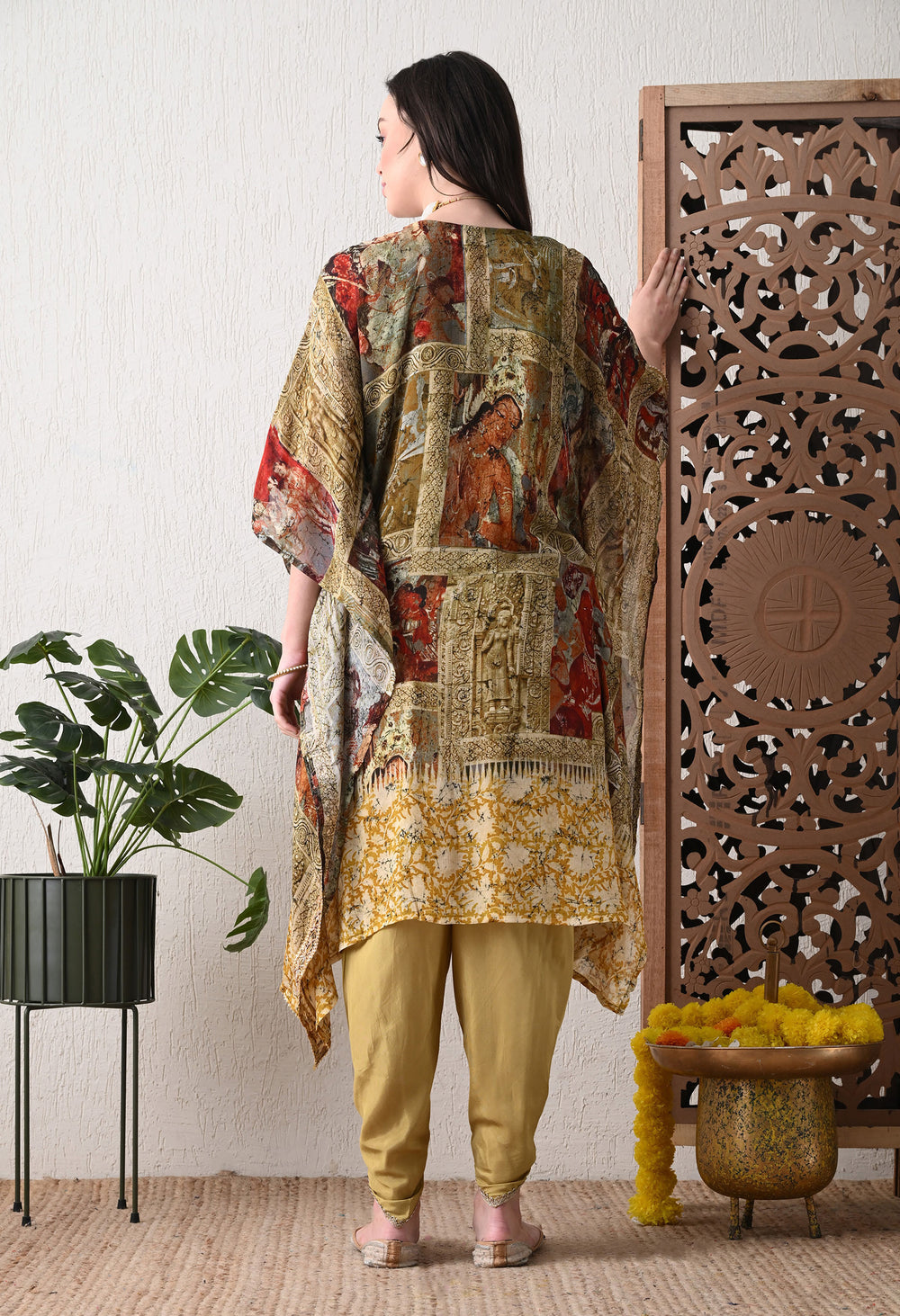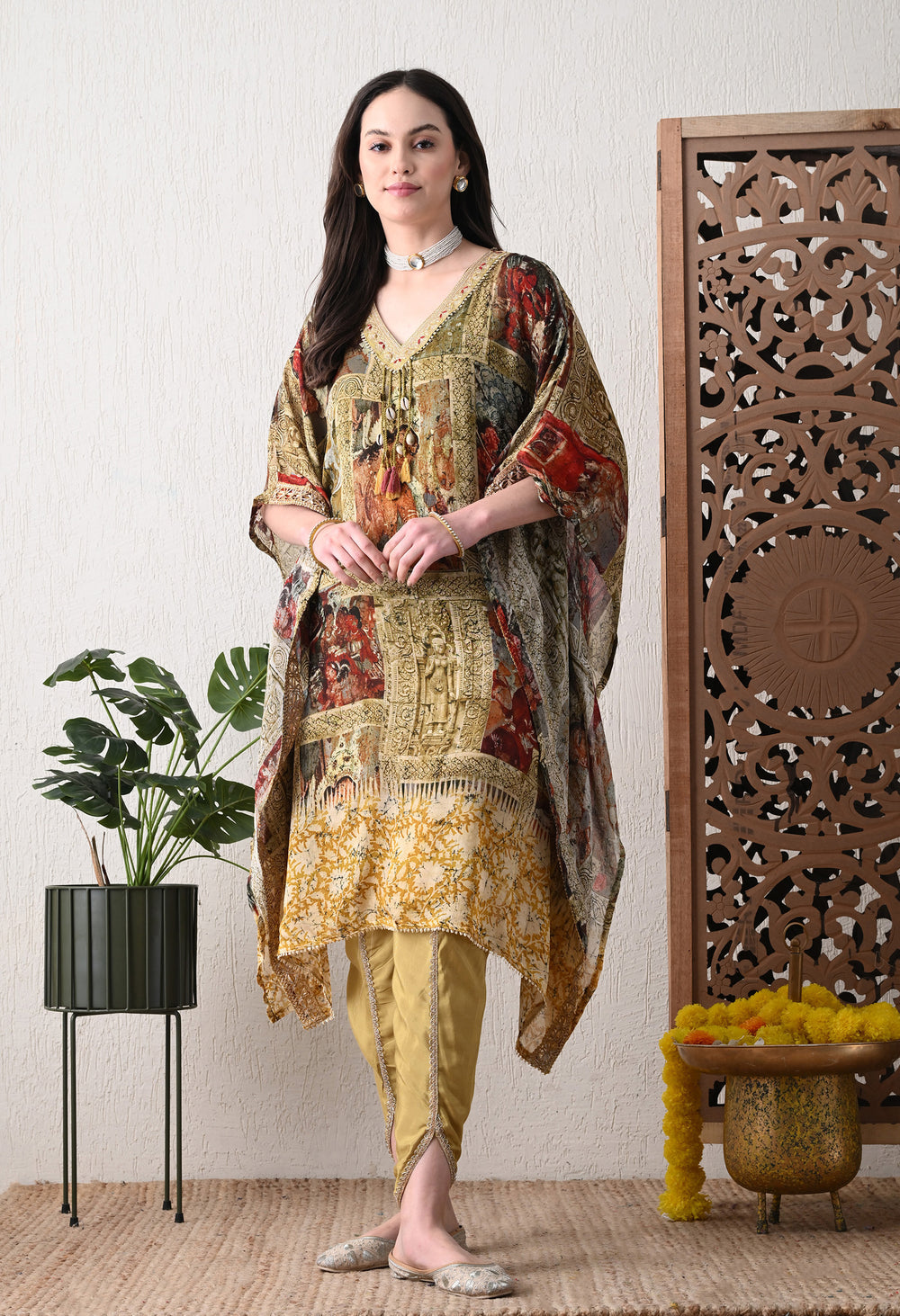 Experience elegance with our beautiful, pure Chinnon digital print kaftan, perfectly complemented by a matching potli and stylish tulip pants. Ideal for any occasion!