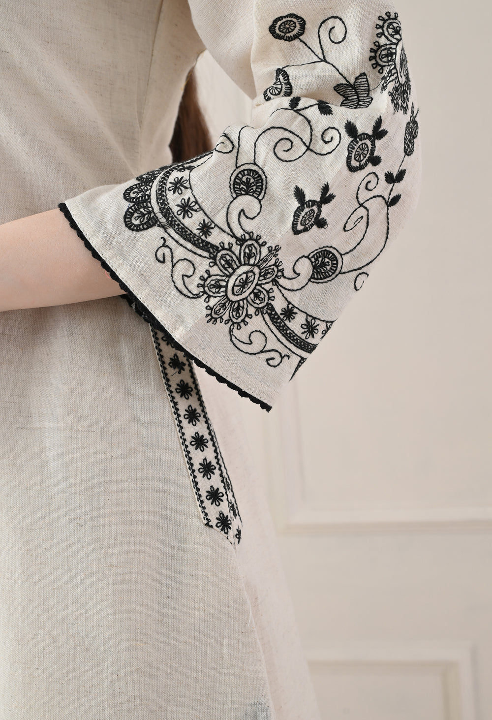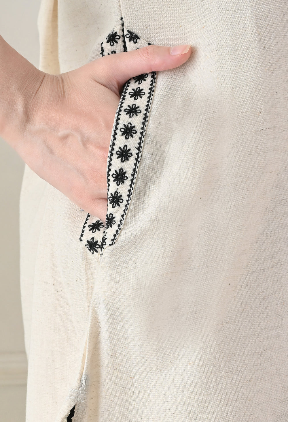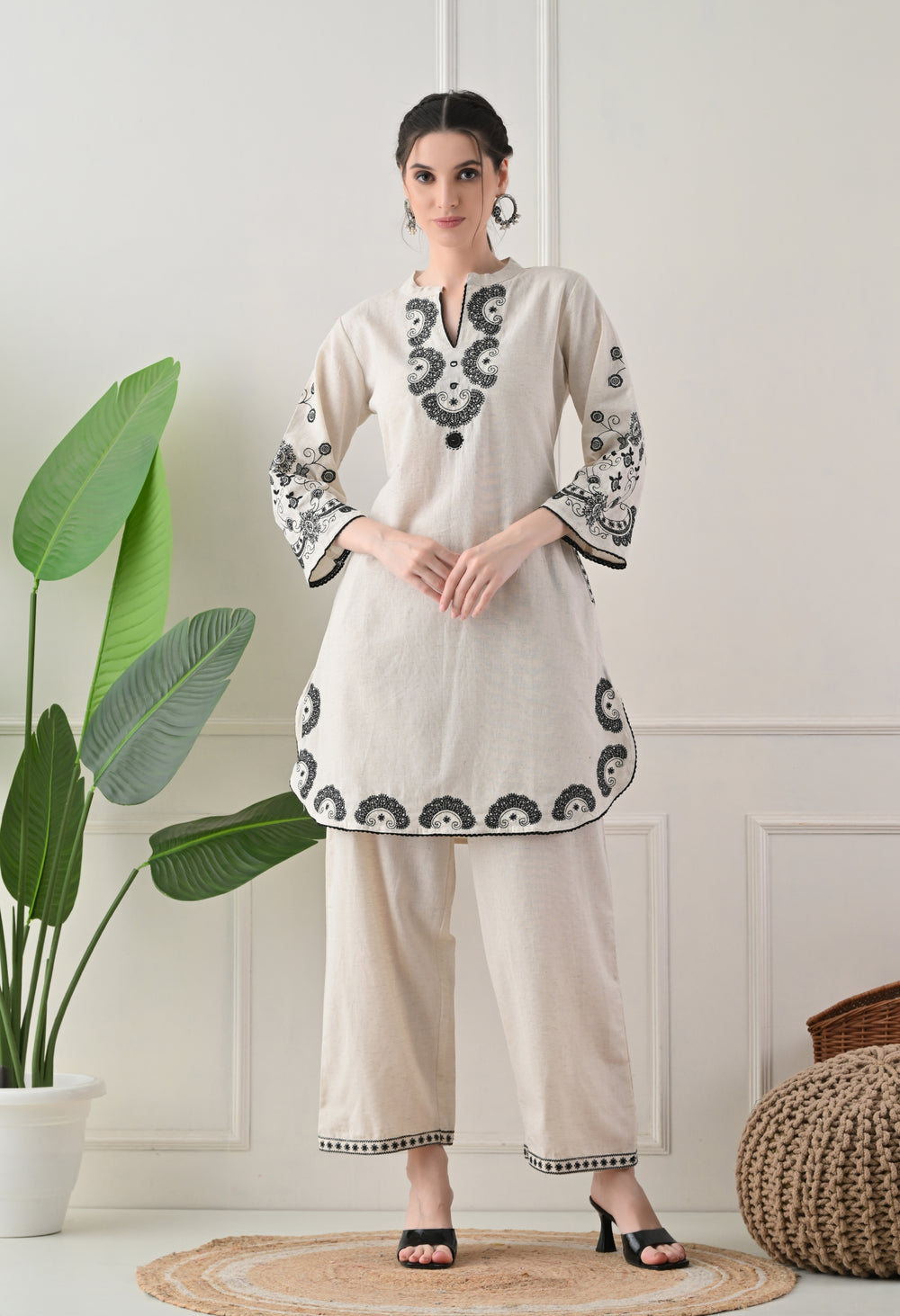 Cream Black Cotton Embroidered Co-ord Set- Set of 2