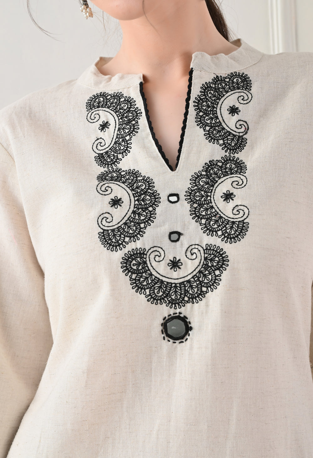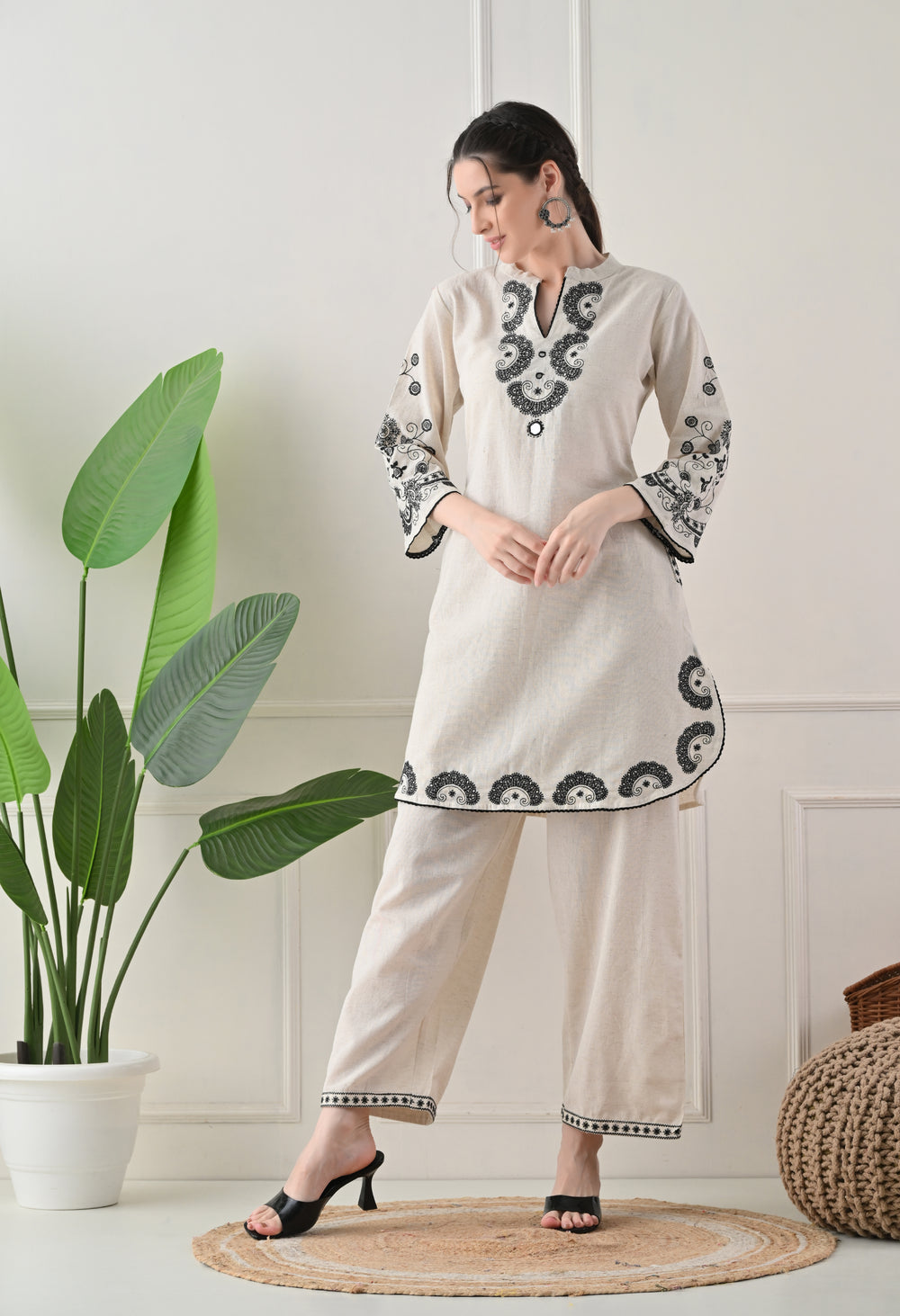 Exquisite cream cotton co-ord set featuring beautiful and neat embroidery. This stylish ensemble includes: