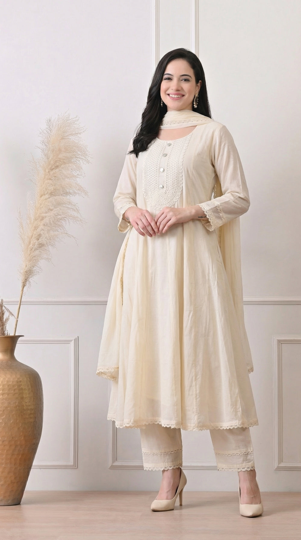 Description Pure elegance in this Cream Cotton Anarkali suit. The kurta features a Crochet yoke with delicate lace detailing and button details. The set includes an anarkali kurta with lace detailing paired with smart pants finished with Crochet lace borders and a soft, coordinated dupatta with 4 side Crochet lace borders, creating a sophisticated and breezy look perfect for daytime events.