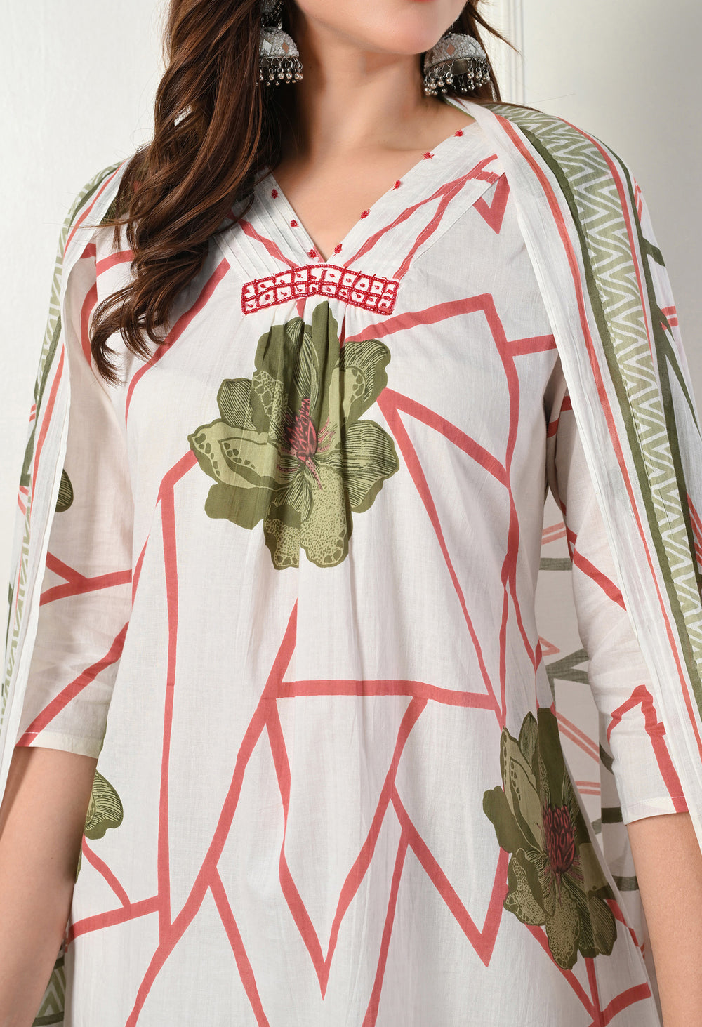 This beautiful soft cotton suit is adorned with intricate beadwork on the neckline. Crafted from summer-friendly fabric, this ensemble is perfect for warm weather.