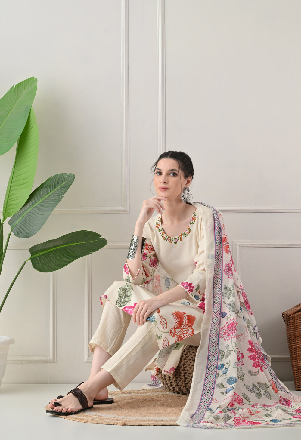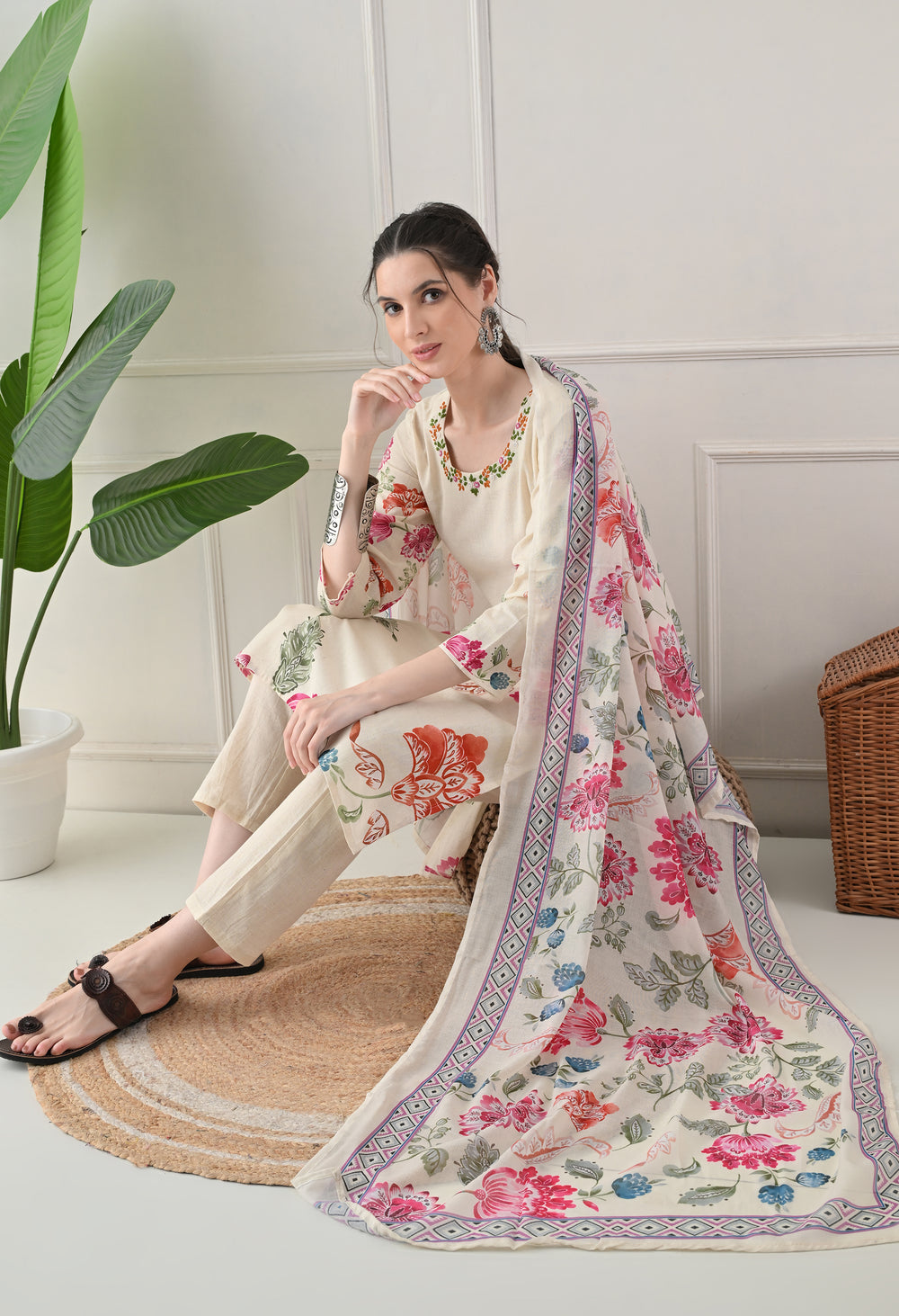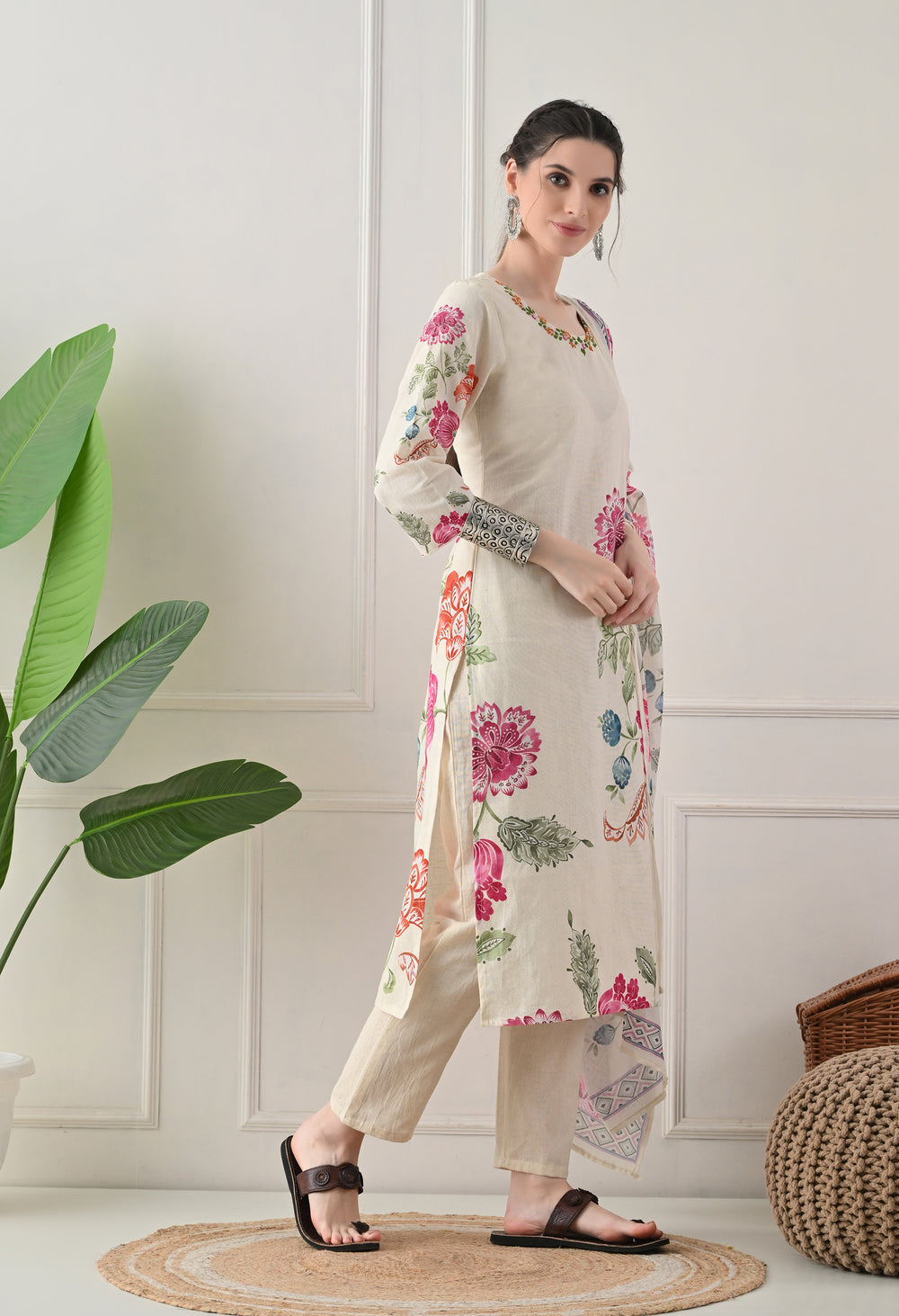 Cream Floral Digital Print Embroidered Cotton Suit- Set of 3