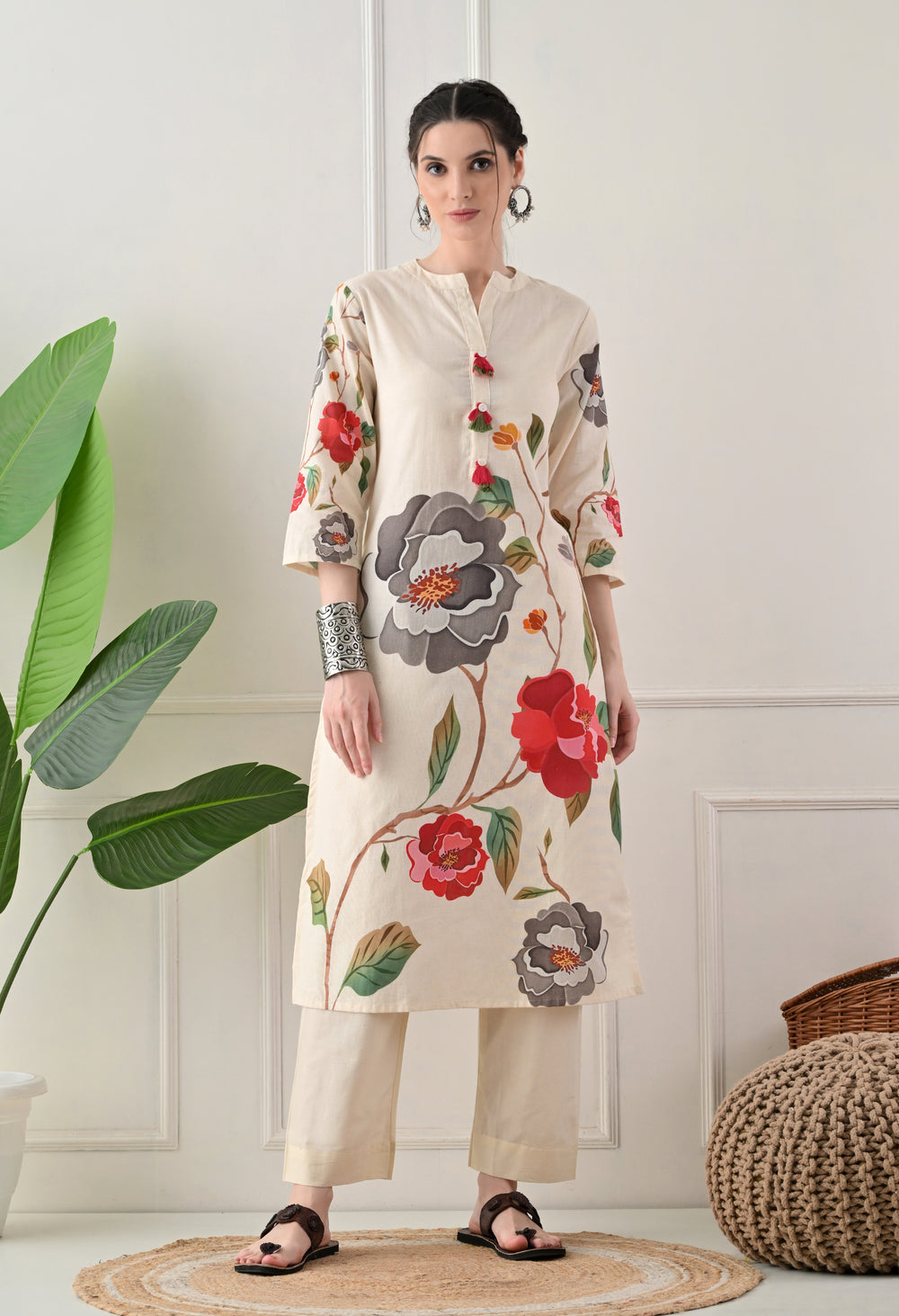 Beautiful floral digital print suit features vibrant colors on a cream base, making it perfect for summer.