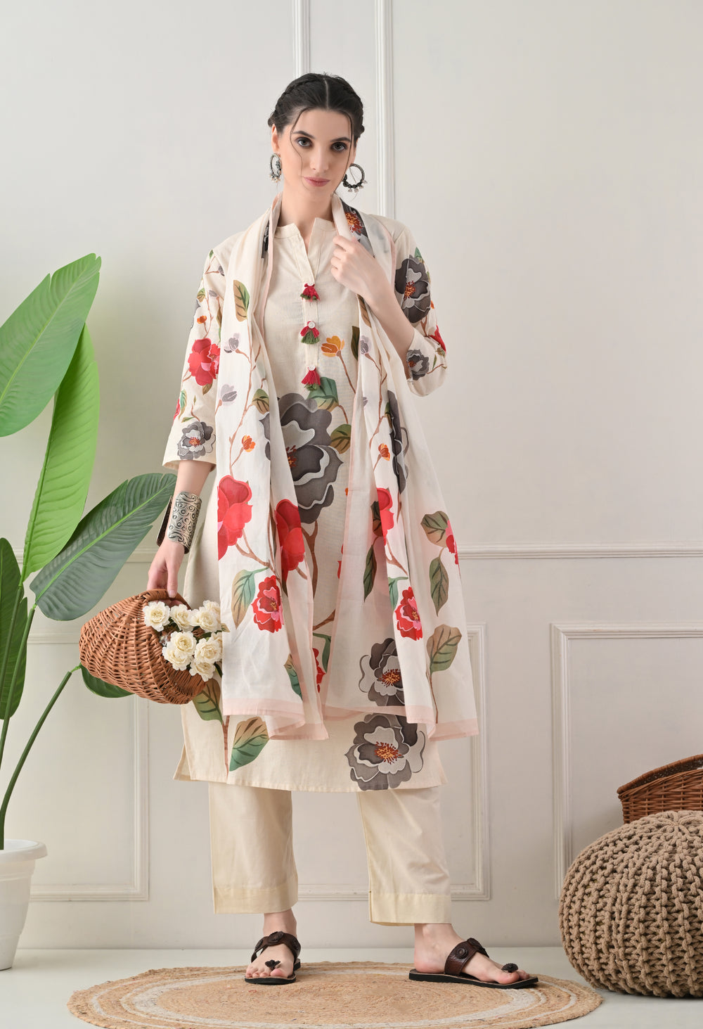 Cream Floral Digital Print Cotton Suit- Set of 3