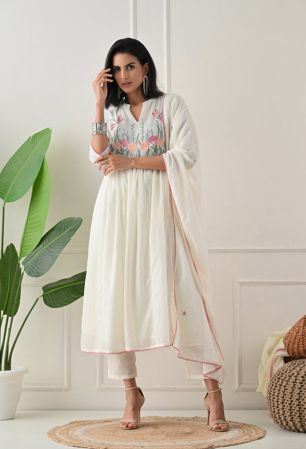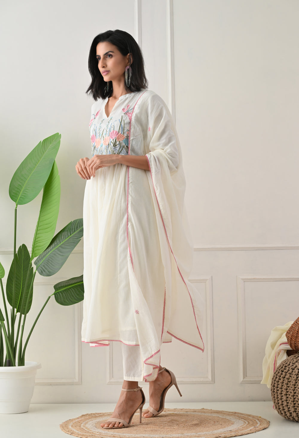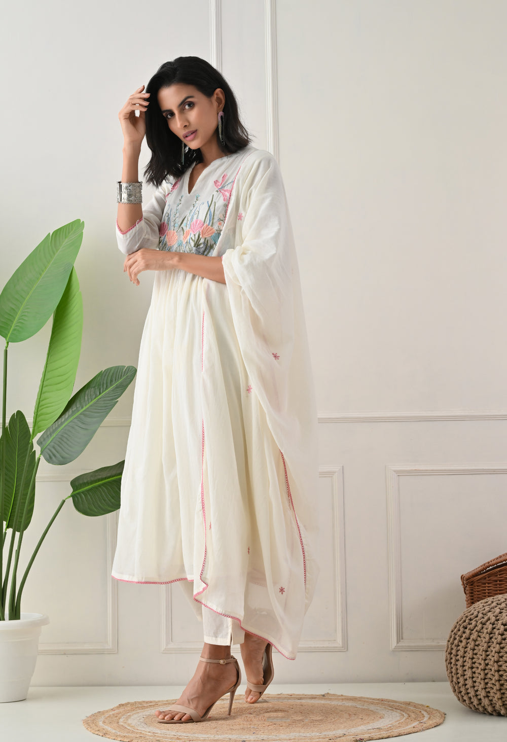 Cream Mul Cotton Embroidered A-Line suit- Set of 3