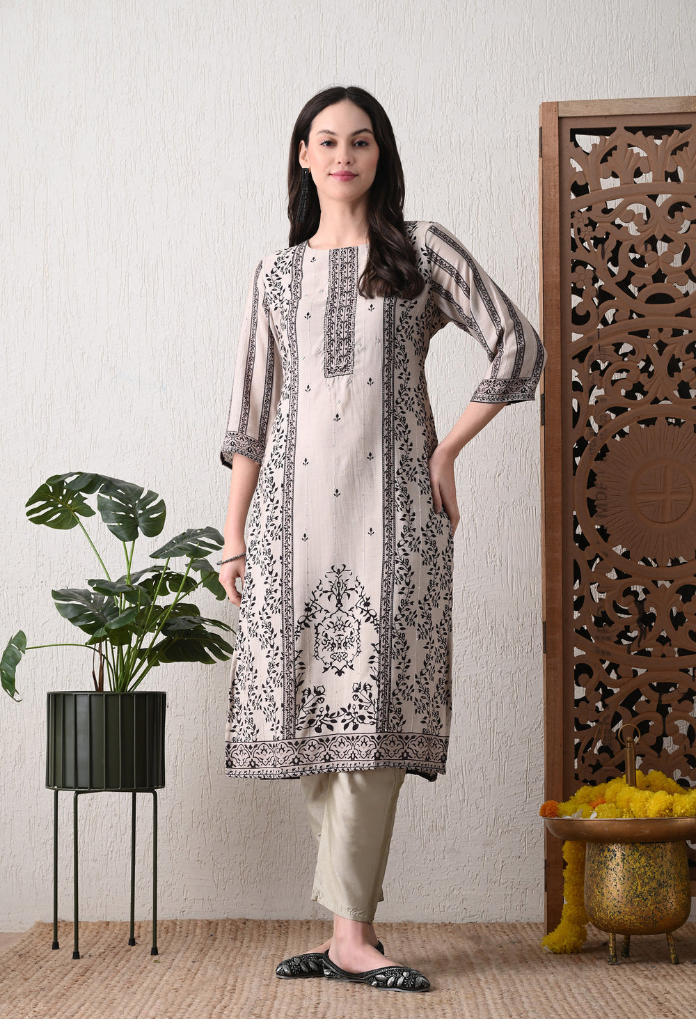 Elegant cream muslin 3-piece set, featuring a kurta, pants, and dupatta adorned with exquisite sequence work. Stitched from soft fabric with an attached lining, this ensemble provides exceptional comfort. Ideal for both casual outings and formal events.