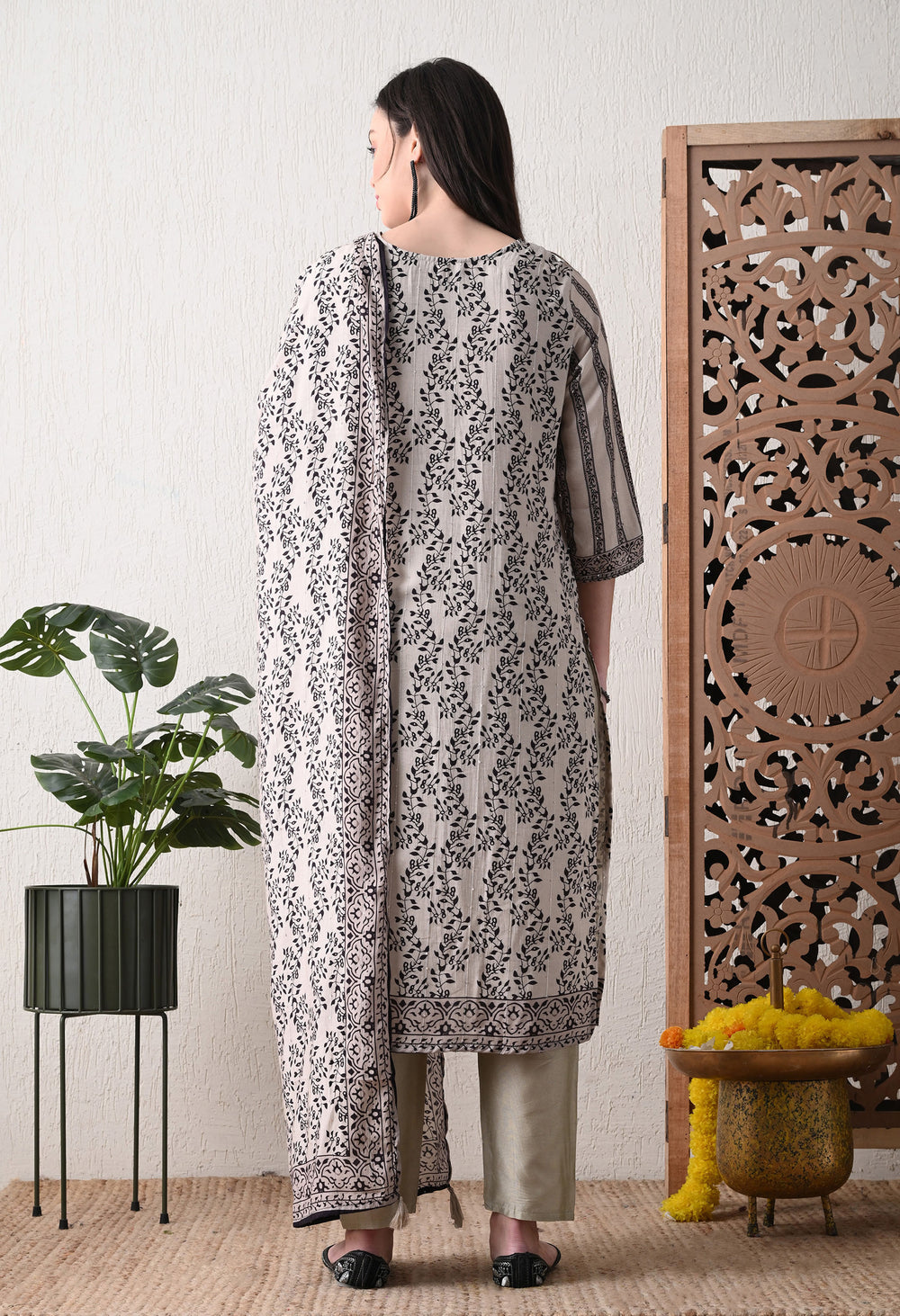Cream Muslin Suit with Sequence Work Detailing- Set of 3