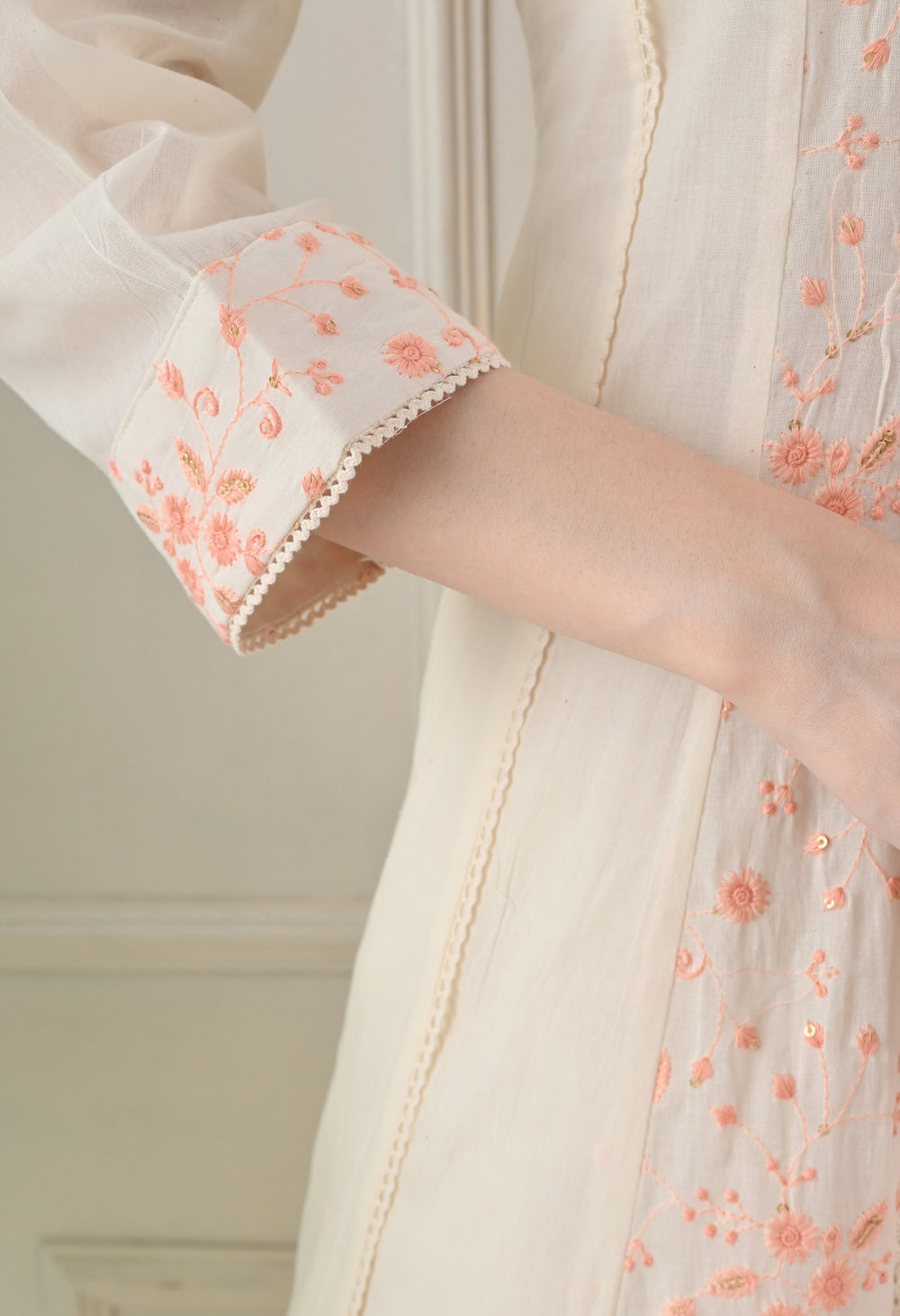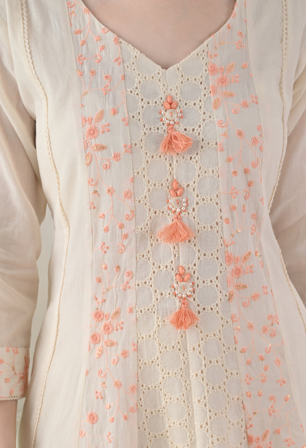Cream Orange Cotton Chikankari Embroidered A-Line Suit-Set of 3