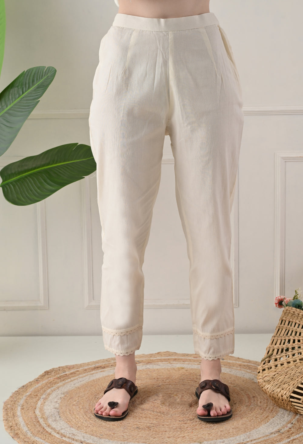 This beautiful cream suit features intricate Chikankari embroidery, adding a touch of elegance to its design. The pants have lace detailing, while the stunning double-shade chiffon dupatta complements the outfit perfectly.