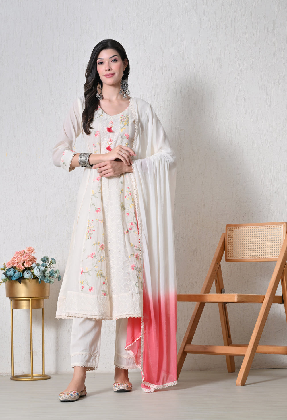 This beautiful cream suit features intricate Chikankari embroidery, adding a touch of elegance to its design. The pants have lace detailing, while the stunning double-shade chiffon dupatta complements the outfit perfectly.