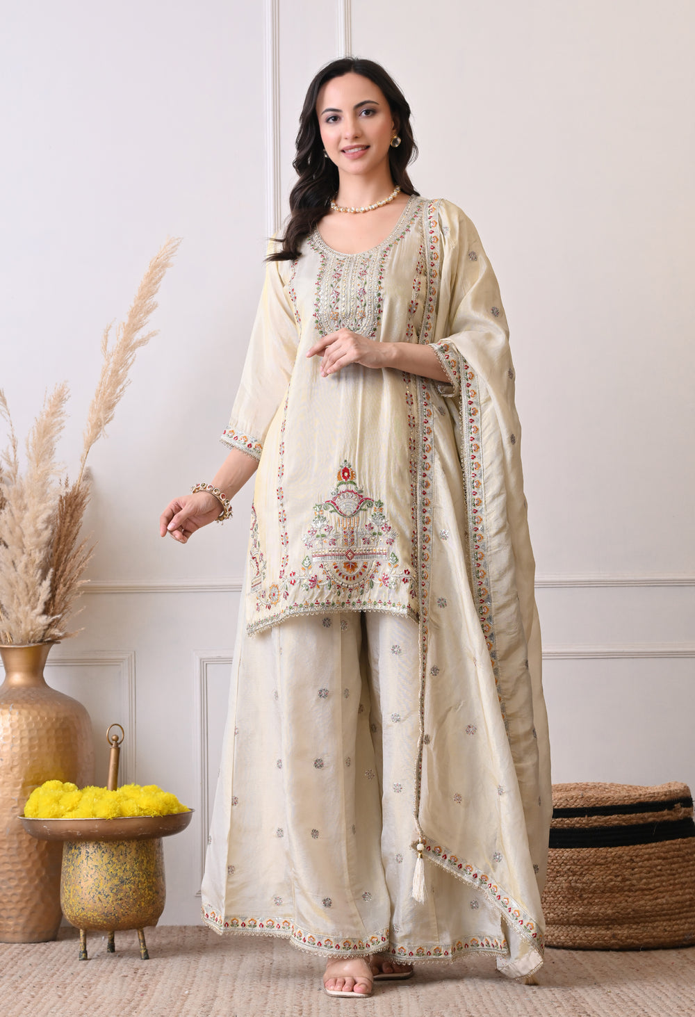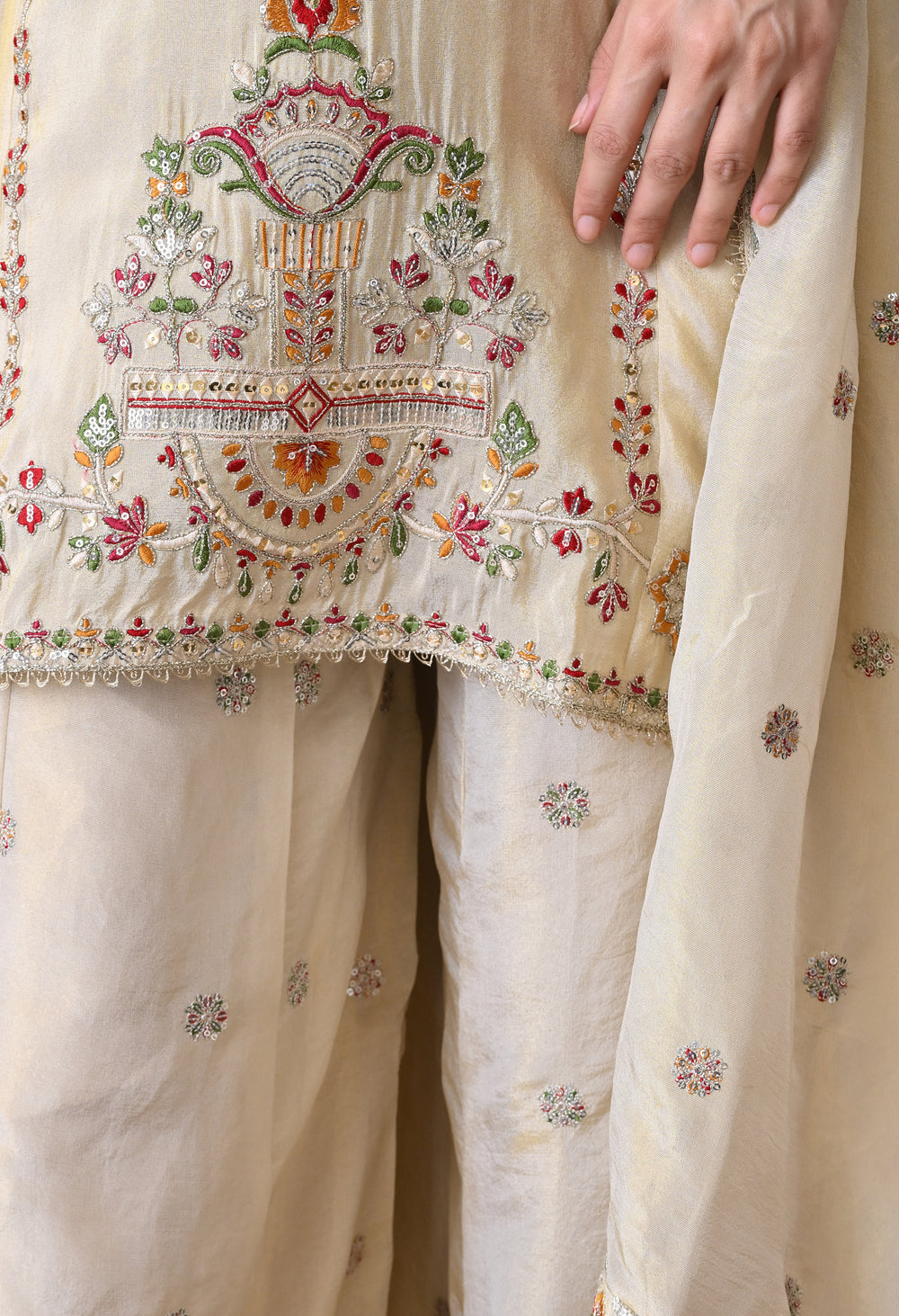 Cream Tissue Shimmer Embroidered Sharara Suit- Set of 3