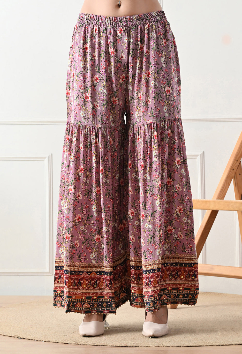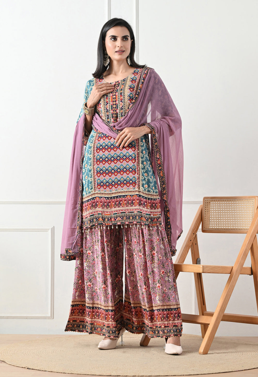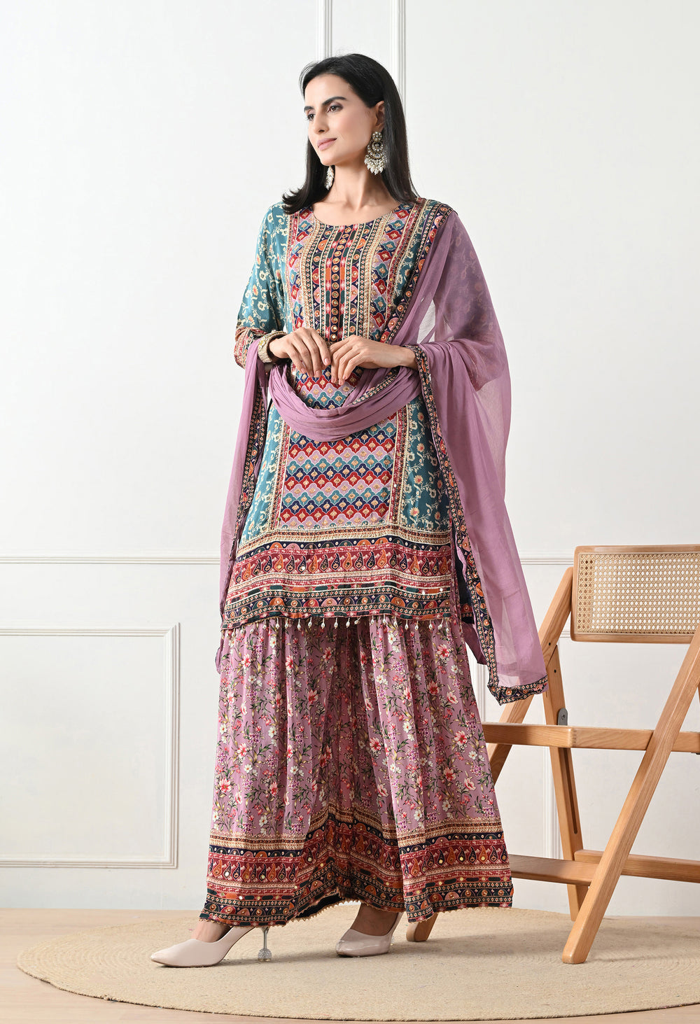 Crepe Turquoise & Lavender Digital Print Gharara Suit - Set of 3