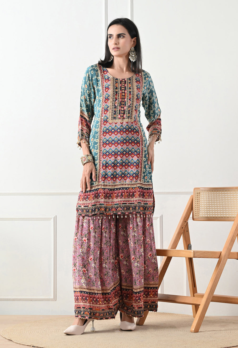 - A complete set that includes a kurta, gharara, and a gorgeous chiffon dupatta with four-side borders