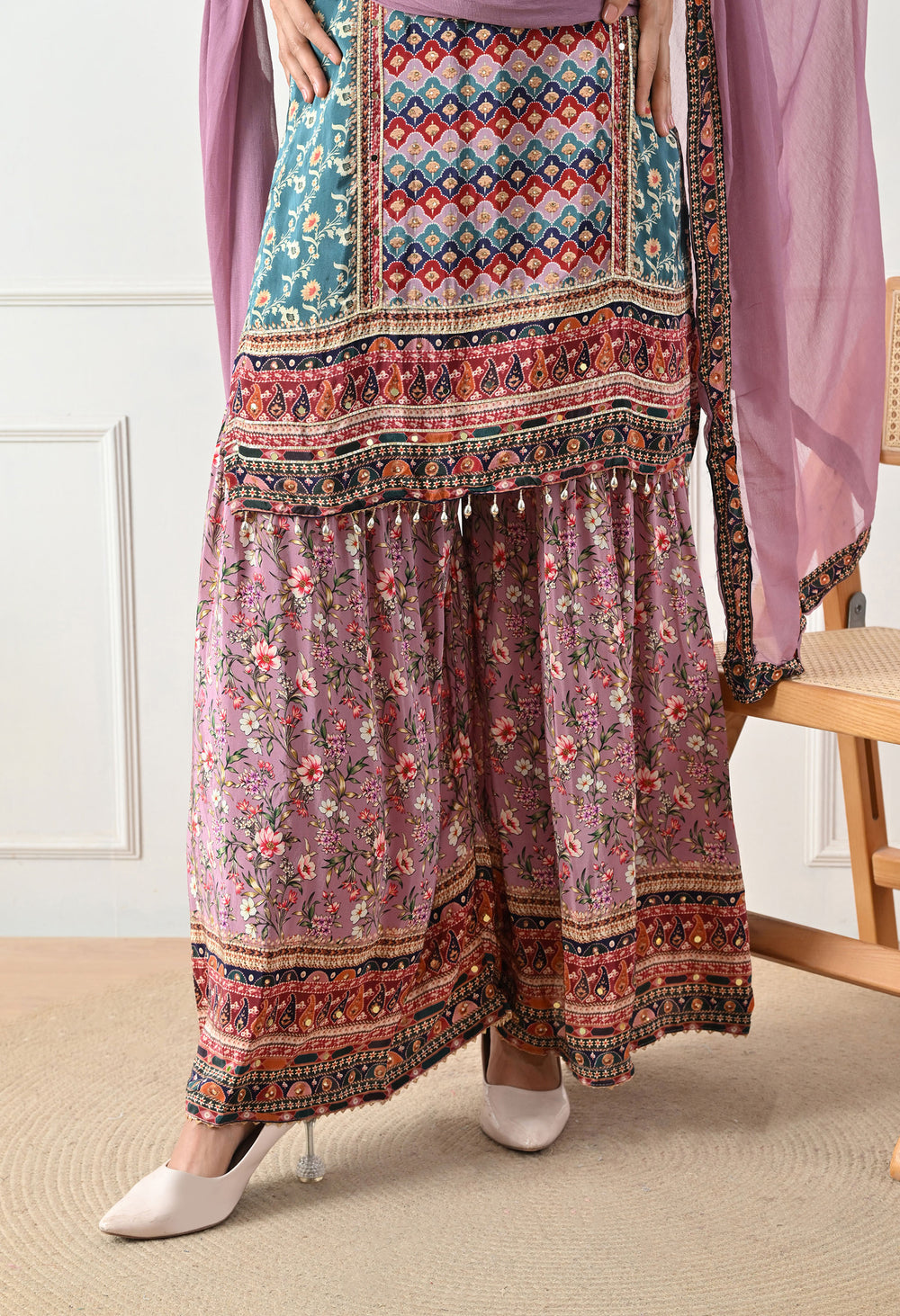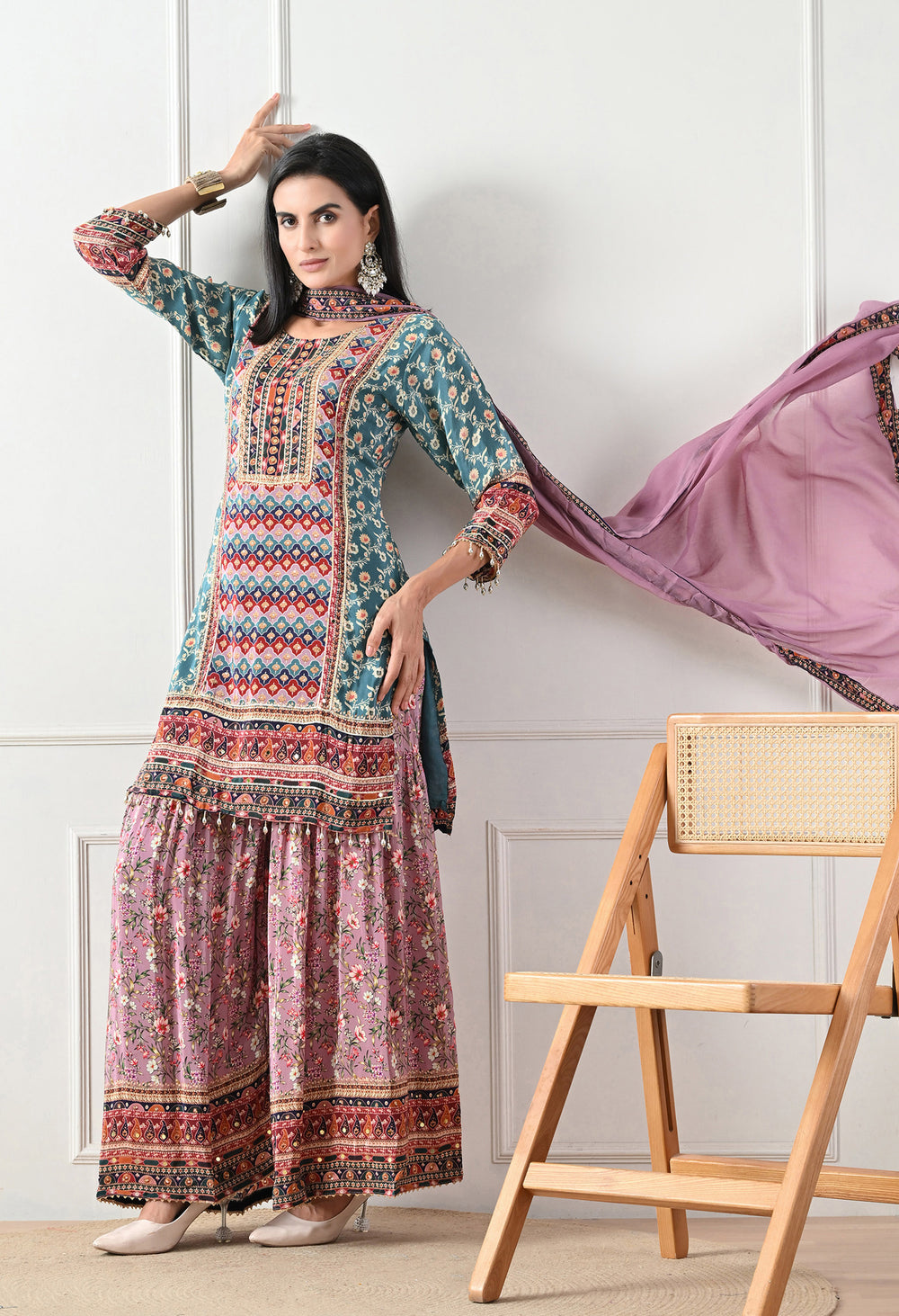 Crepe Turquoise & Lavender Digital Print Gharara Suit - Set of 3