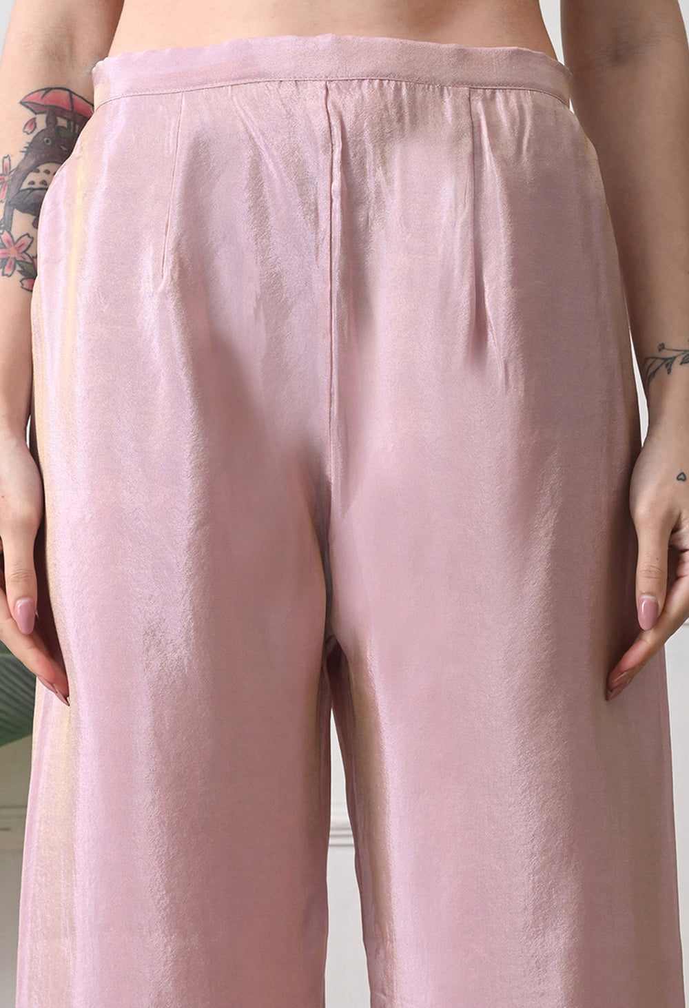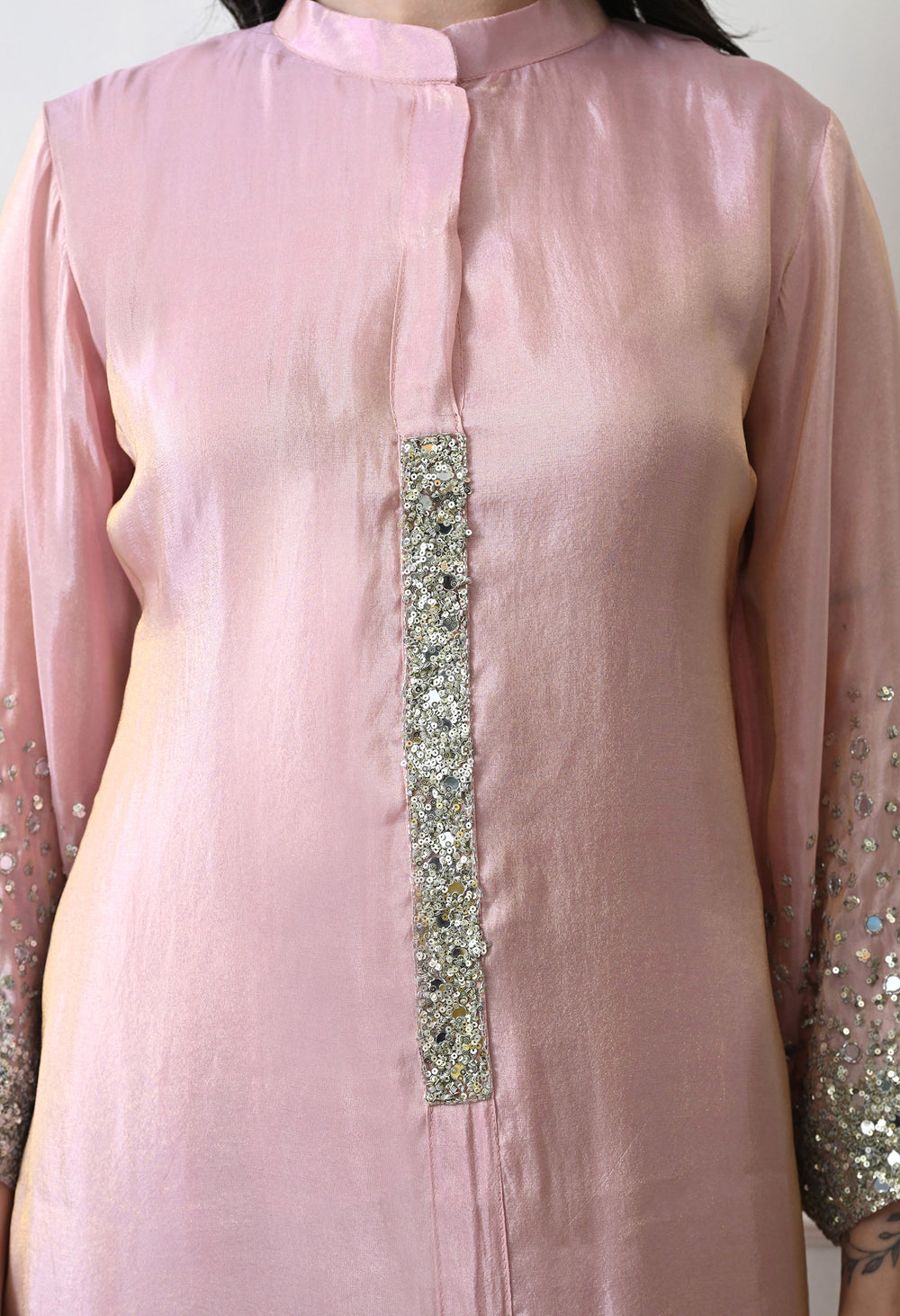Description Glow with modern sophistication in this Dusty Rose Tissue Silk set. The kurta features a luxurious metallic sheen and a band collar with a sequin-embellished placket running down the neckline. The sleeves are the highlight, adorned with heavy, intricate silver sequin work at the cuffs. Paired with relaxed, matching straight pants, this outfit is a choice for evening parties and festive dinners.