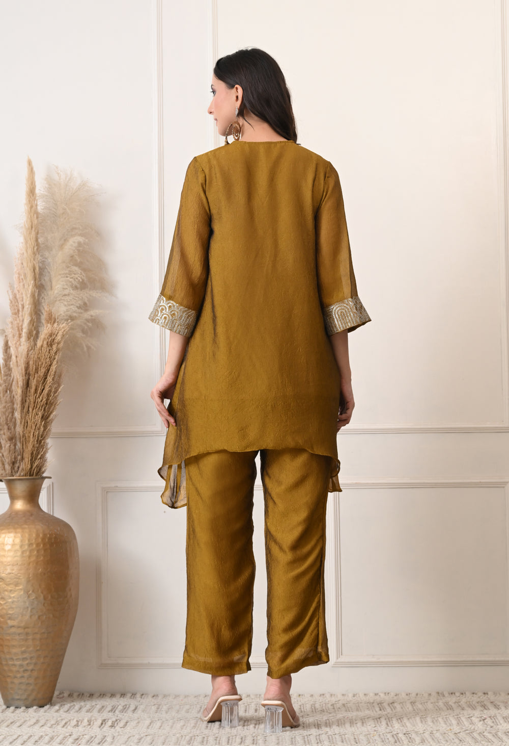 This golden brown co-ord set is ideal for parties, weddings, or any event where you want to shine. The sequin work adds a touch of glamour, making it a perfect choice for festive occasions.