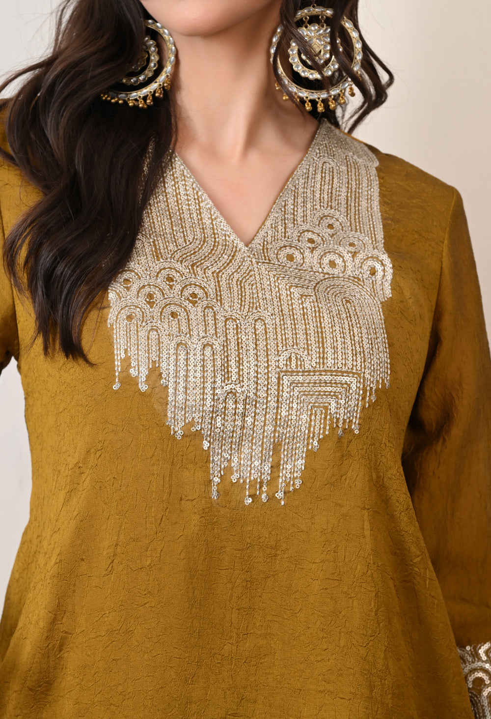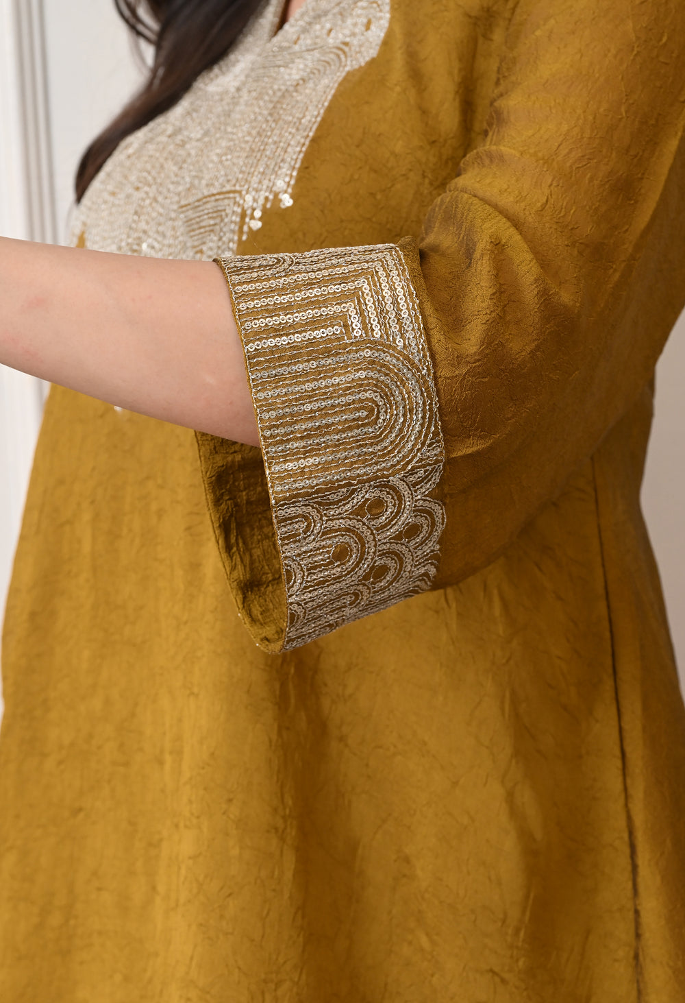 - Kurta: Features beautiful sequin work on the neckline and sleeves,