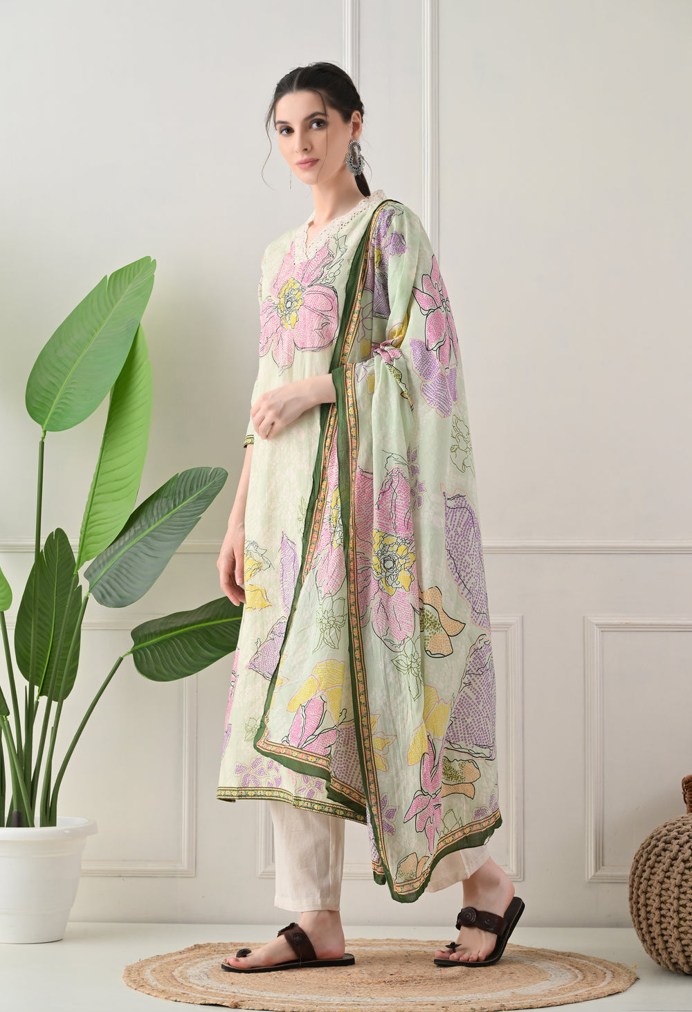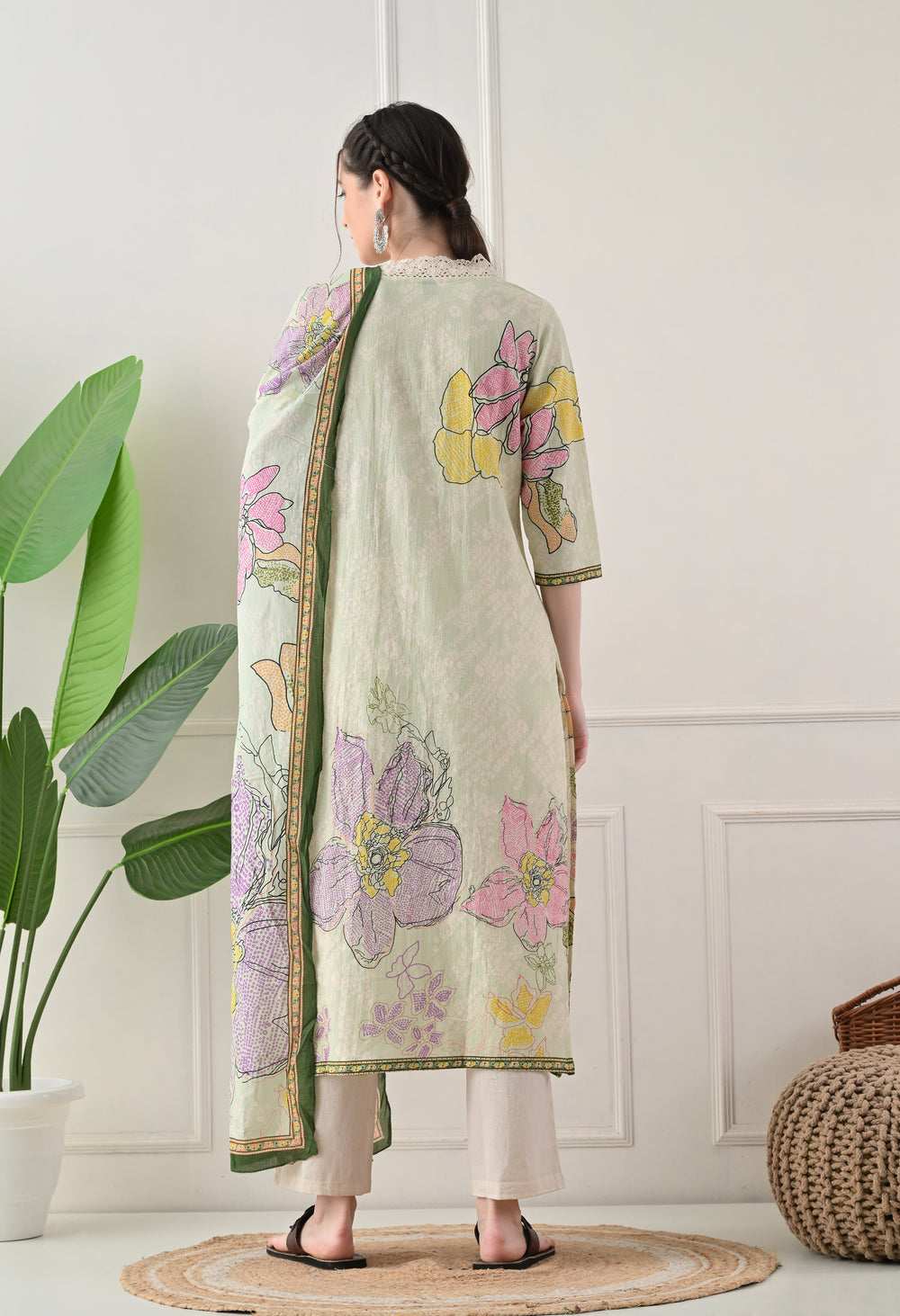 This pure cotton digital print suit is very soft and comfortable, making it a stylish choice. The intricate printing and lace detailing on the neckline add a touch of elegance. The suit comes with pants and a mulmul dupatta with the same print, completing the look.