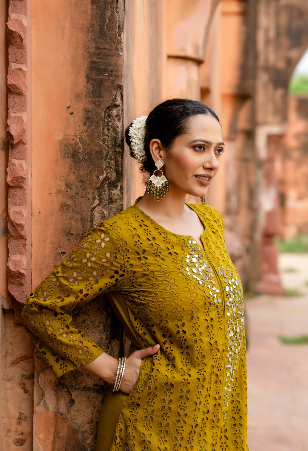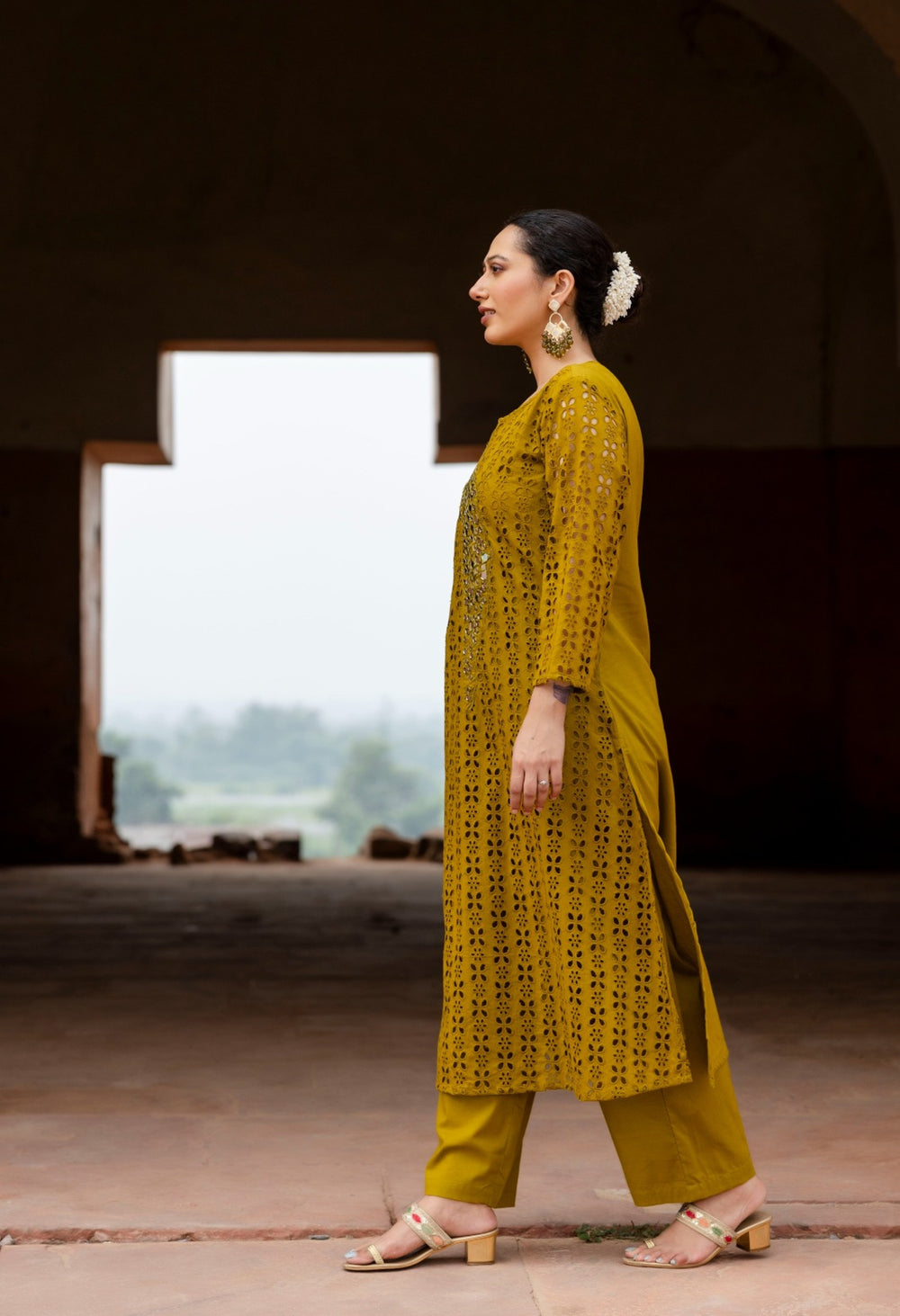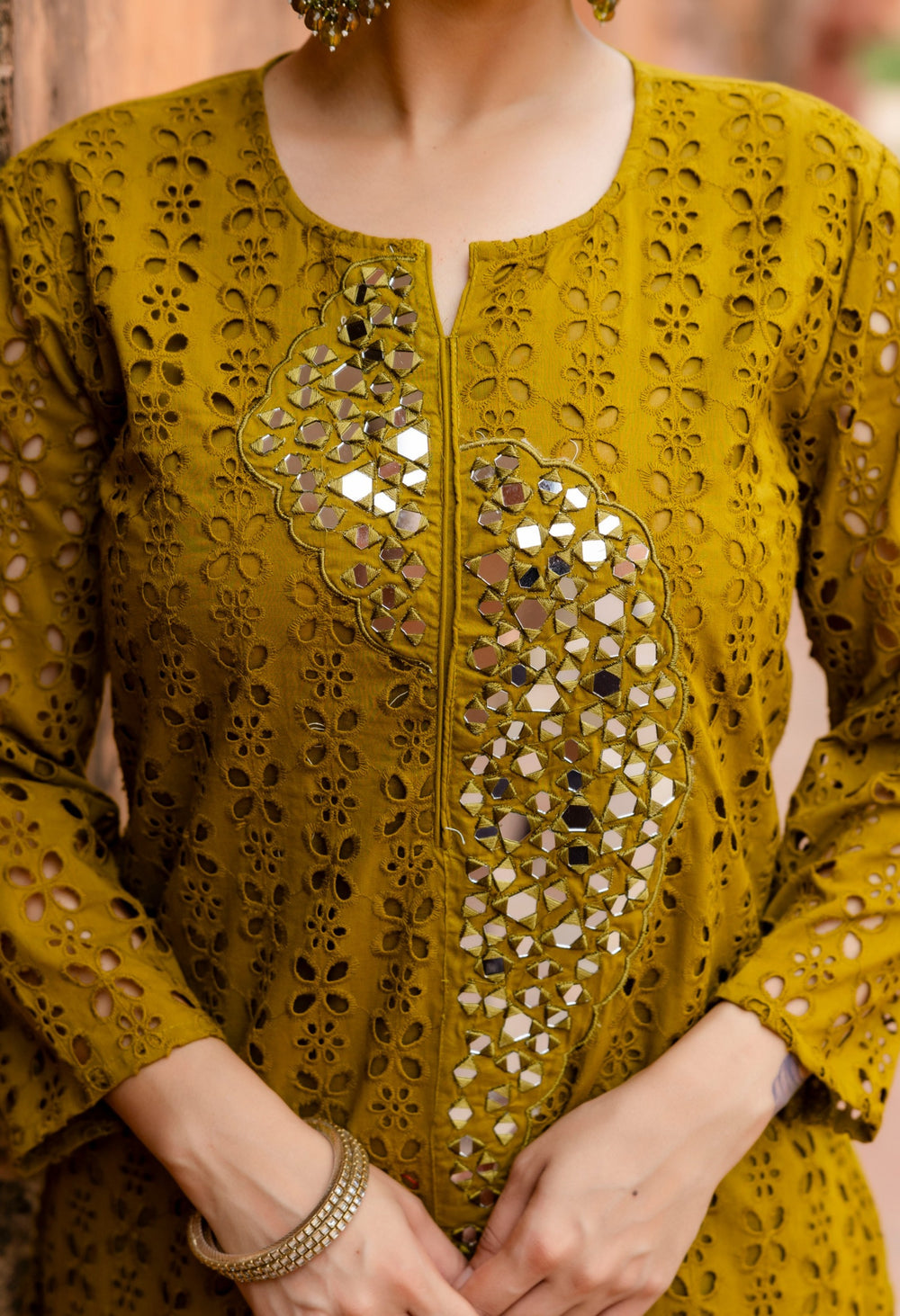 This beautiful cotton Schiffli kurta set features intricate real mirror work detailing, adding a touch of elegance. The kurta has pockets for added convenience. Made from super-soft and comfortable pure cotton fabric, this set includes an A-line Schiffli work kurta paired with smart pants. Perfect for all occasions, this kurta set is a versatile and stylish addition to your wardrobe.