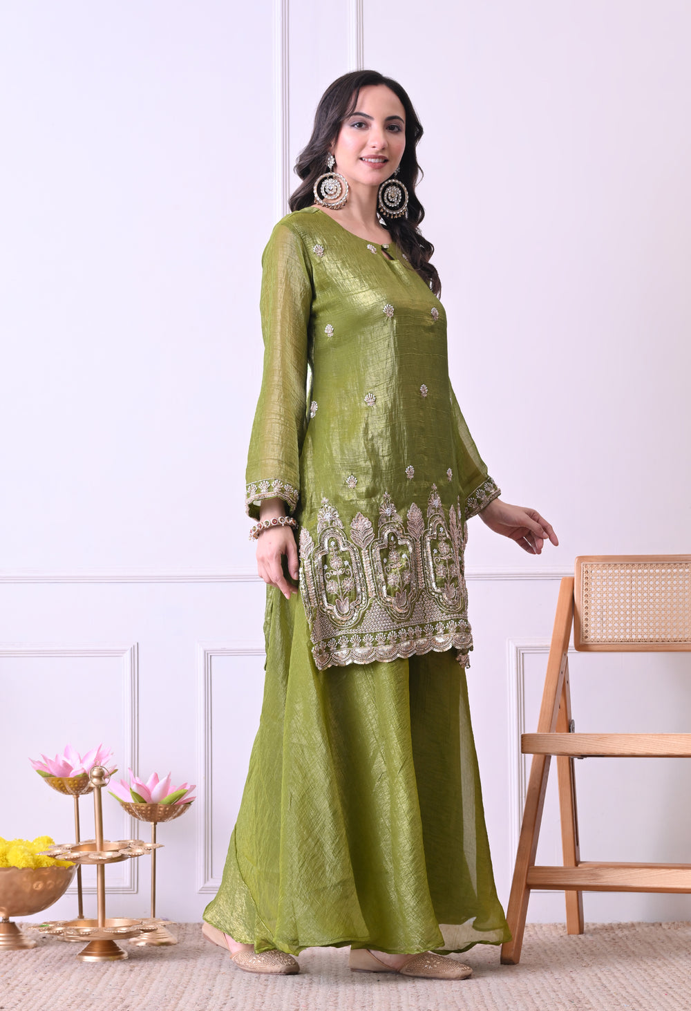 A stunning green crush tissue sharara suit made from super‑soft fabric with an attached mul lining for added comfort. The kurta features beautiful hand‑embroidered beads, sequins, and zari work, while the dupatta is embellished with sequins and zari embroidery. The set includes a matching sharara pant, making it an outstanding piece for any occasion.