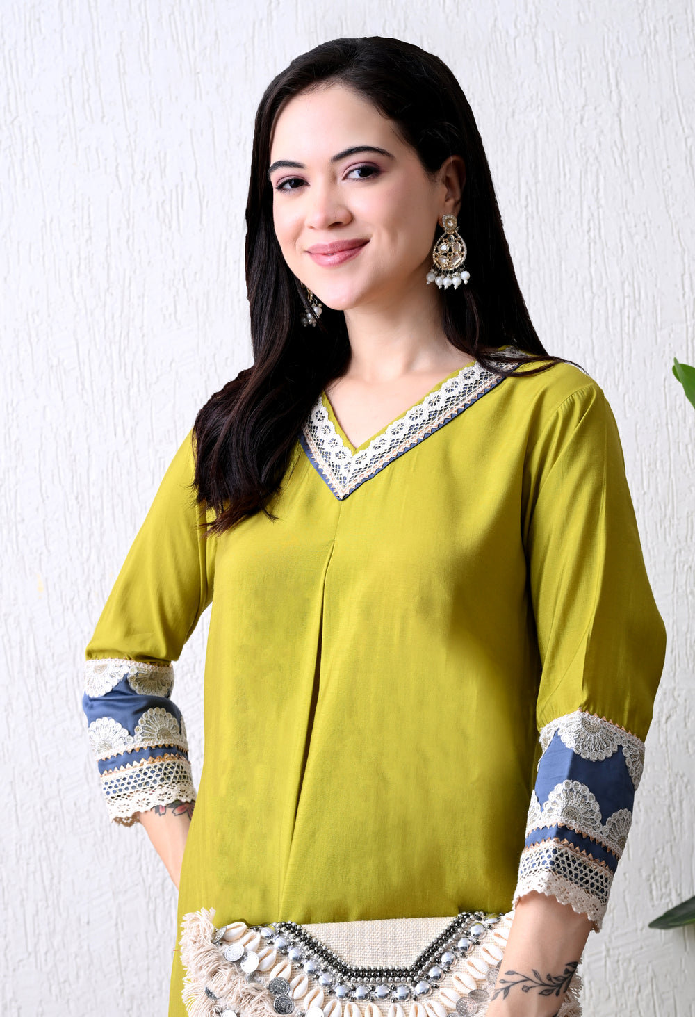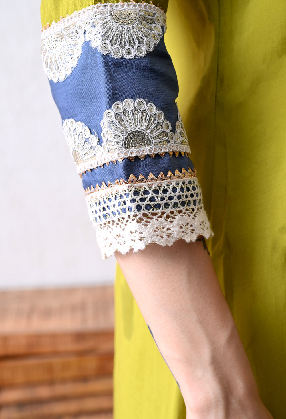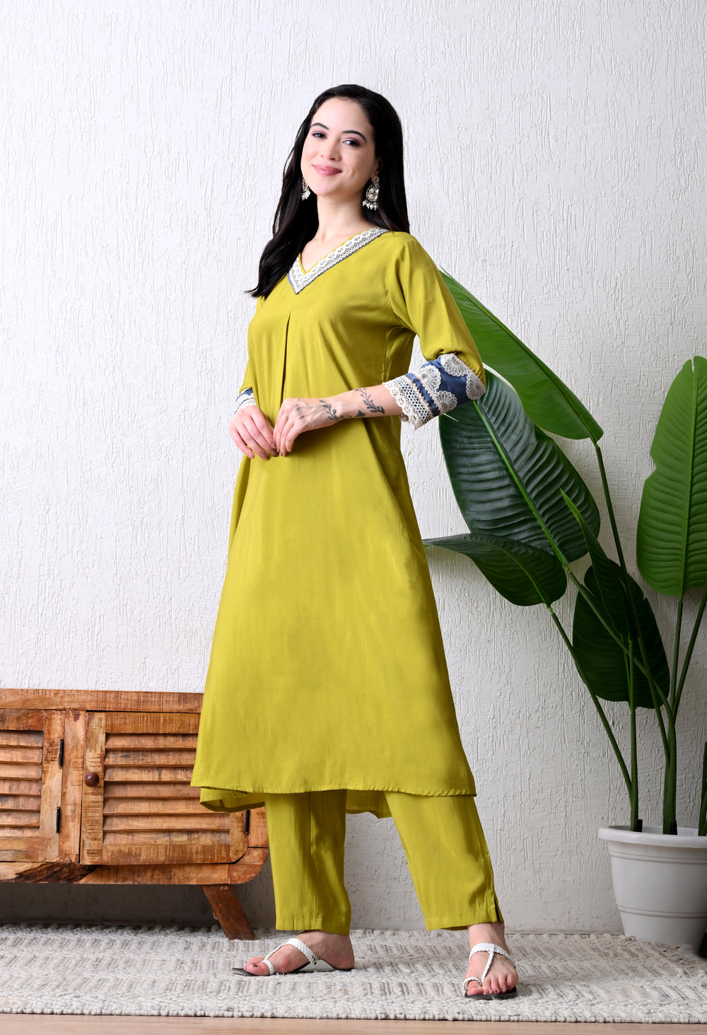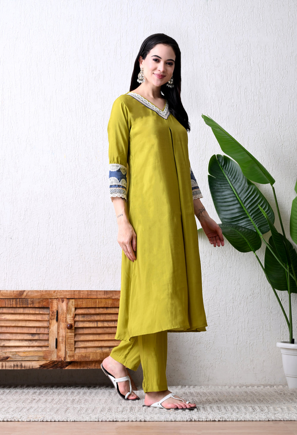This beautiful A-line kurta set features intricate gotta Patti and lace detailing on the neckline, complemented by gorgeous gotta Patti and sequin work on the sleeves. The smart A-line kurta is paired with smart pants, creating a comfortable and stylish outfit.