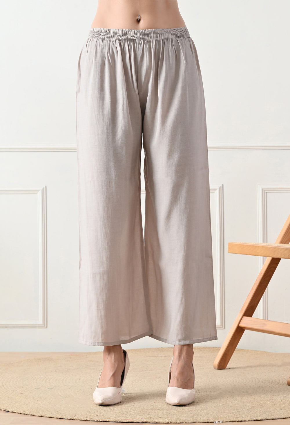 The set includes a beautifully embroidered kurta, palazzo pants, and an embroidered dupatta.