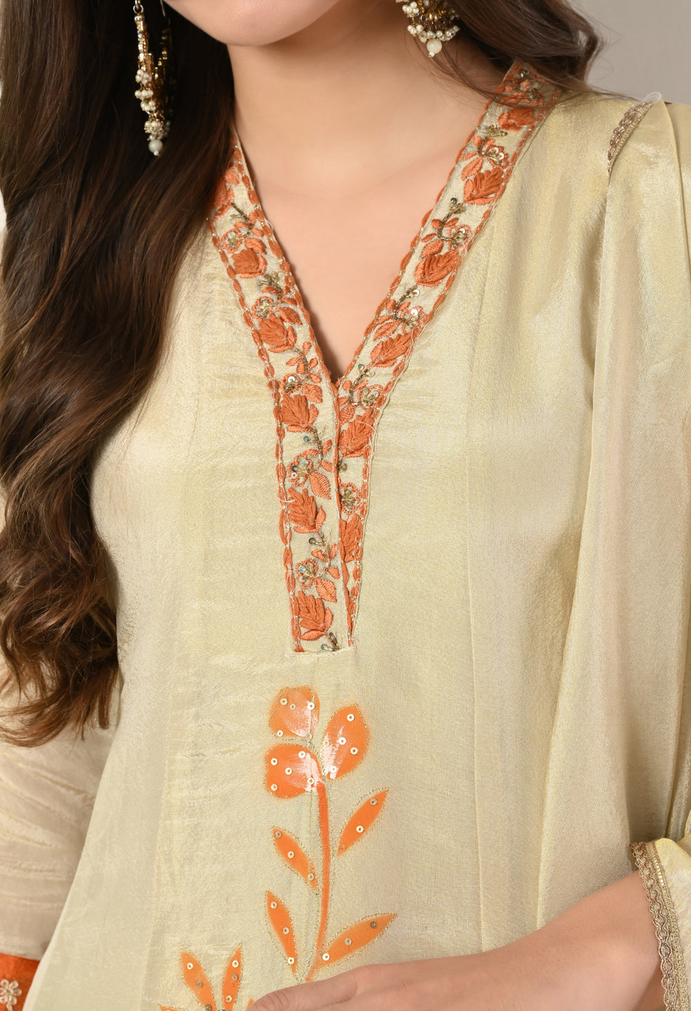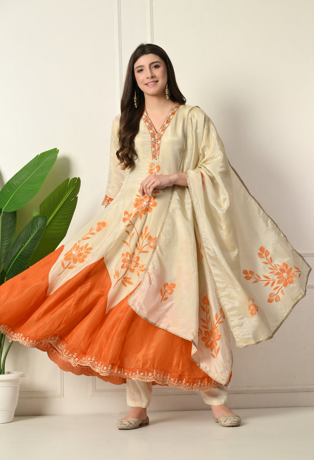Ivory and Orange Shimmer Tissue Digital Print Anarkali Zari Sequin Work and Embroidery - Set of 3