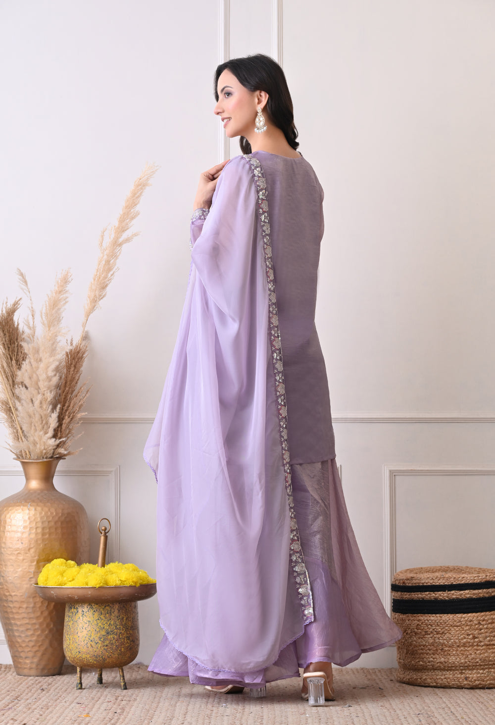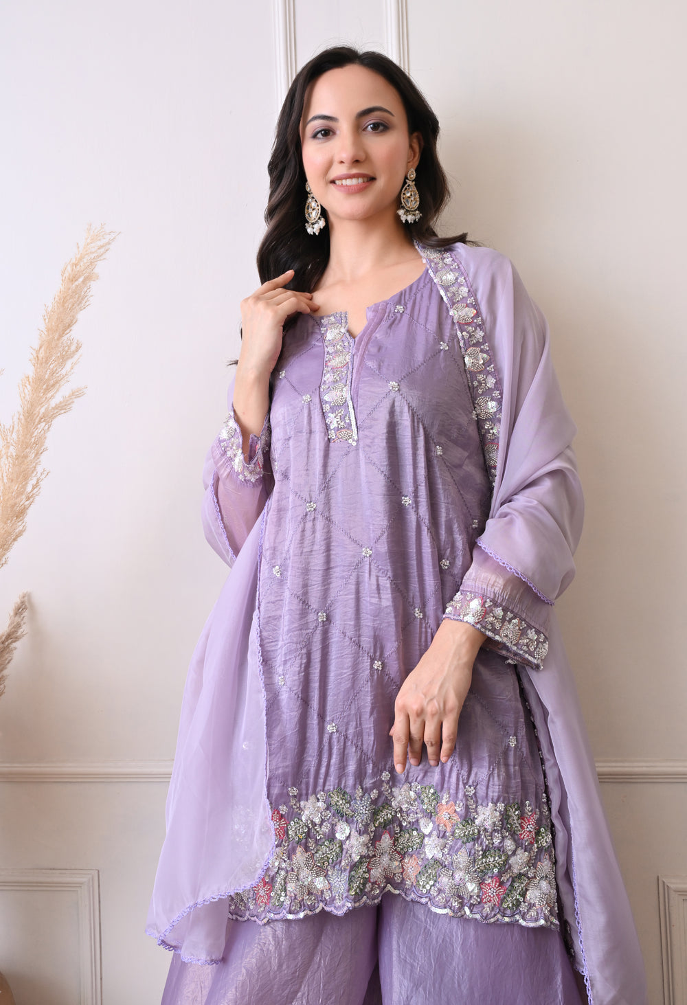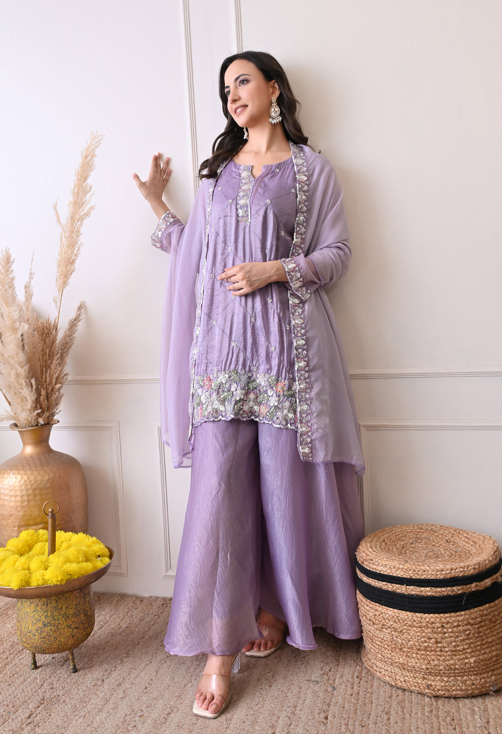 Lavender Crush Organza Beads Sequin Embroidered Sharara Suit - Set of 3
