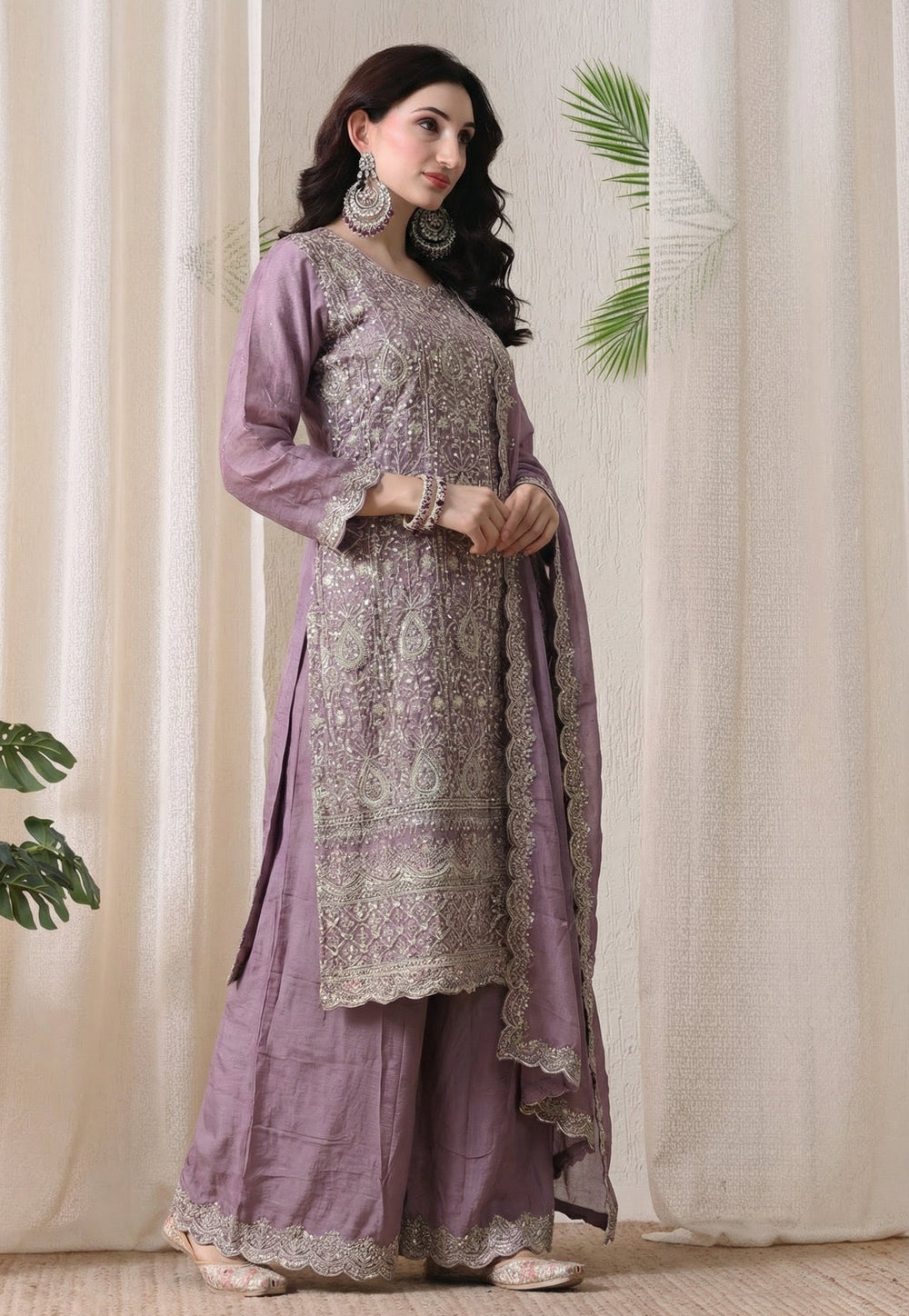 Description Dazzle at your next event in this exquisite Lavender Sharara set. The kurta has an intricate, heavy silver zari and thread embroidery, creating a shimmering, textured look. It is paired with a flared sharara with an embroidered border. A dupatta with a detailed border completes this high-glamour ensemble, perfect for wedding receptions and festive parties.